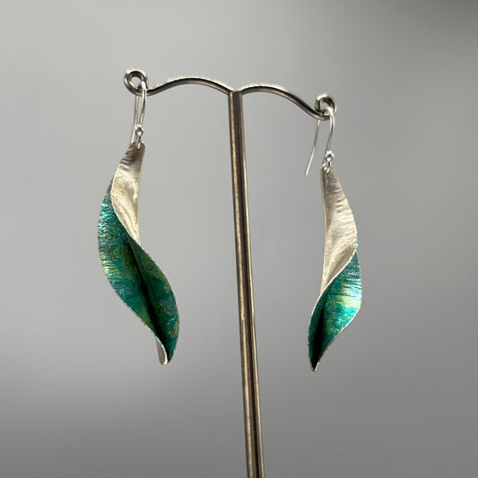 Victoria Sackwild 'Willow Leaf' Silver & Colourful Metallic Foils Drop Earrings (dark blue/turquoise/copper)