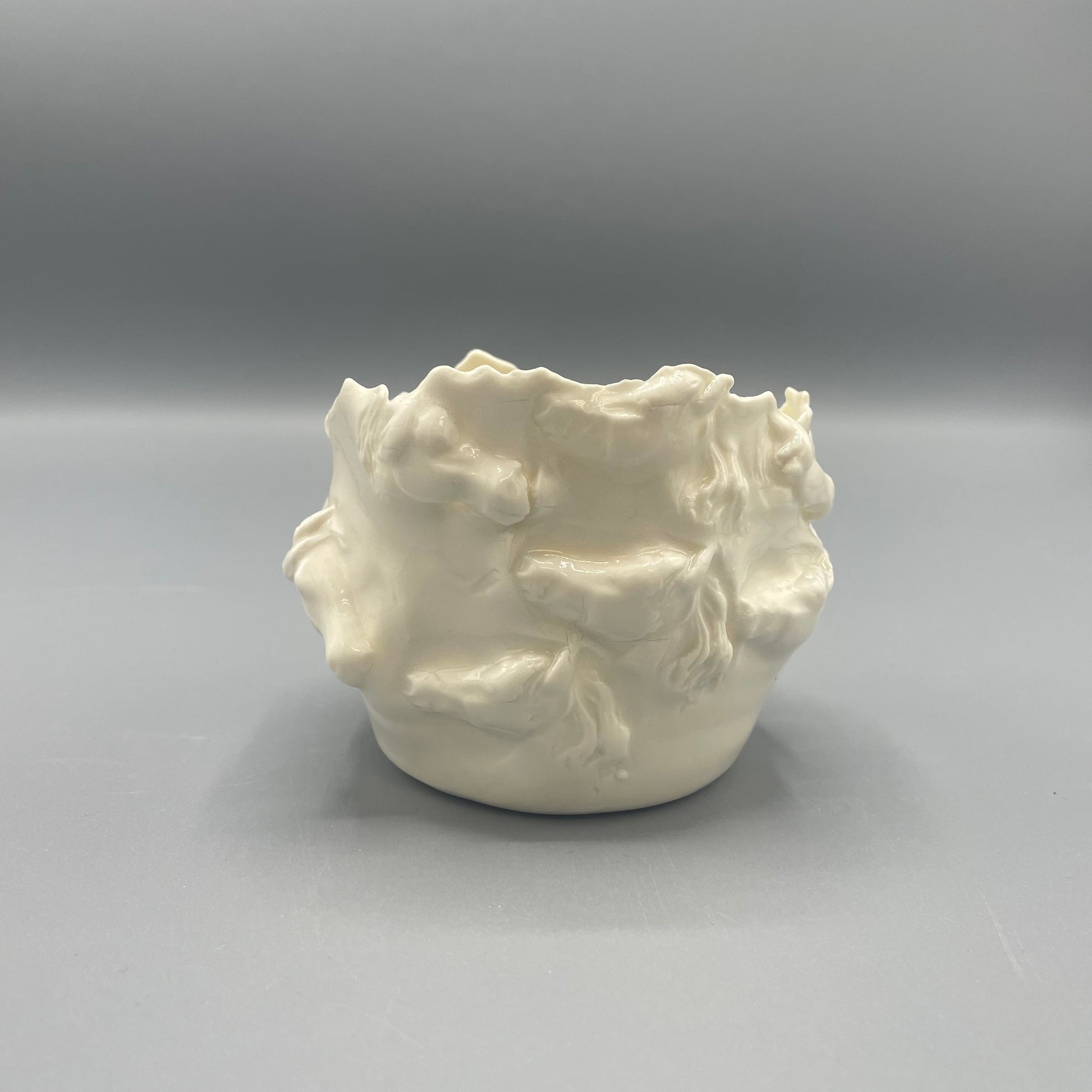 Porcelain vessel with delicate figurative horse heads by Anja Lubach. The uneven rim embodies the mystical essence of this delicate vessel.