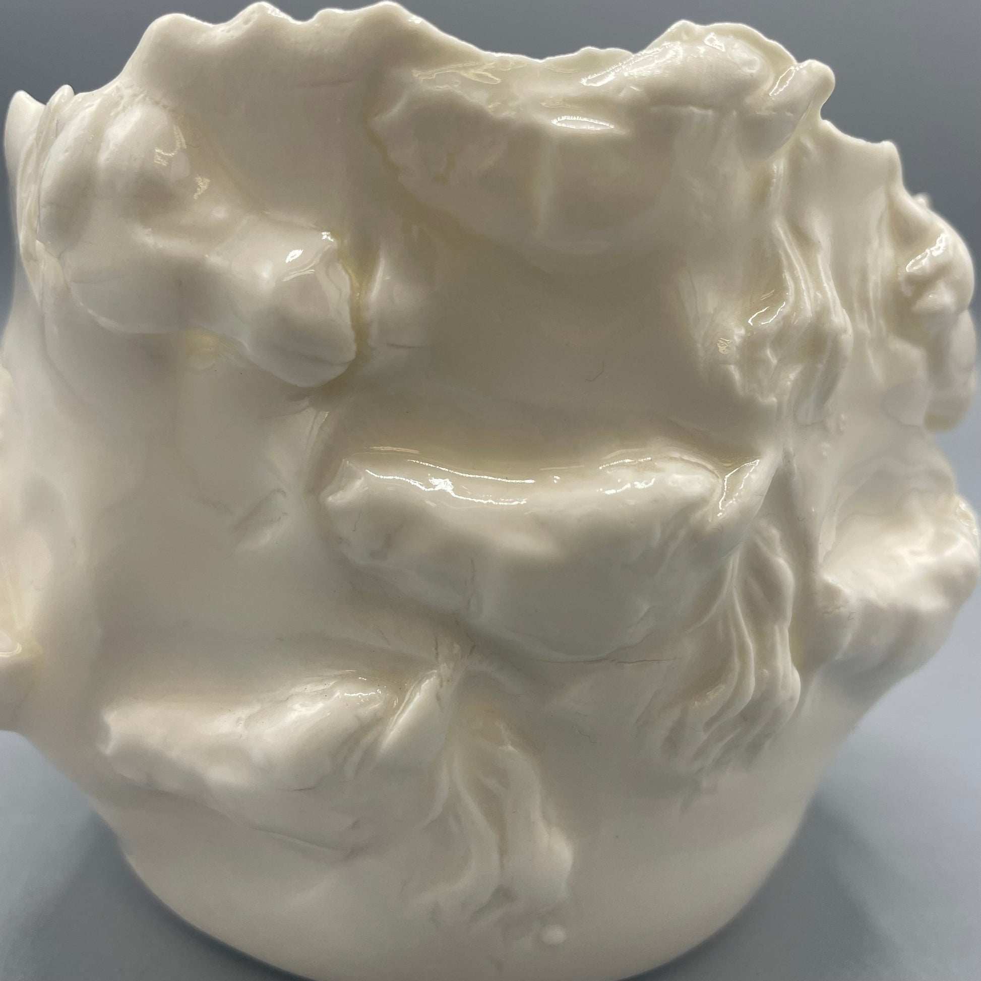 Figurative details are taken from religious figurines, the human body and ornamental surfaces. These are then transferred as delicate 3D relief back onto the wheel thrown vessel walls, appearing to push through the surface of the vessels with a sense of animation and metamorphosis.