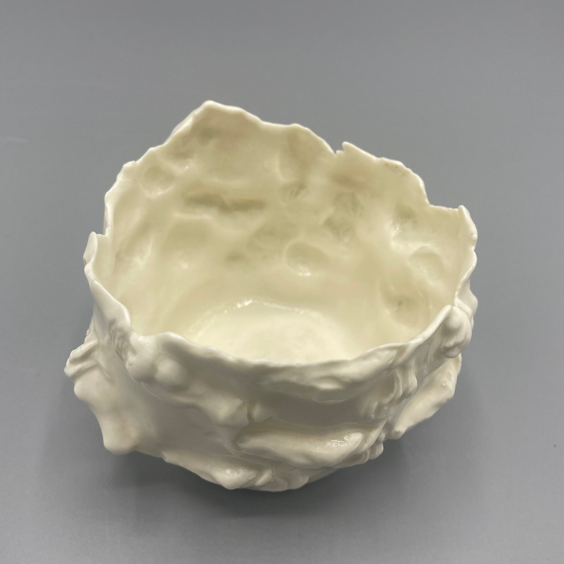 Anja Lubach is a London-based ceramicist. Her work explores the smooth, translucent and pure material properties of porcelain, through experimental manipulation of the soft clay surface. Some pieces are made in a variety of other clays, rough and black or cracking up as layers are breaking the rules of traditional ceramic technique.