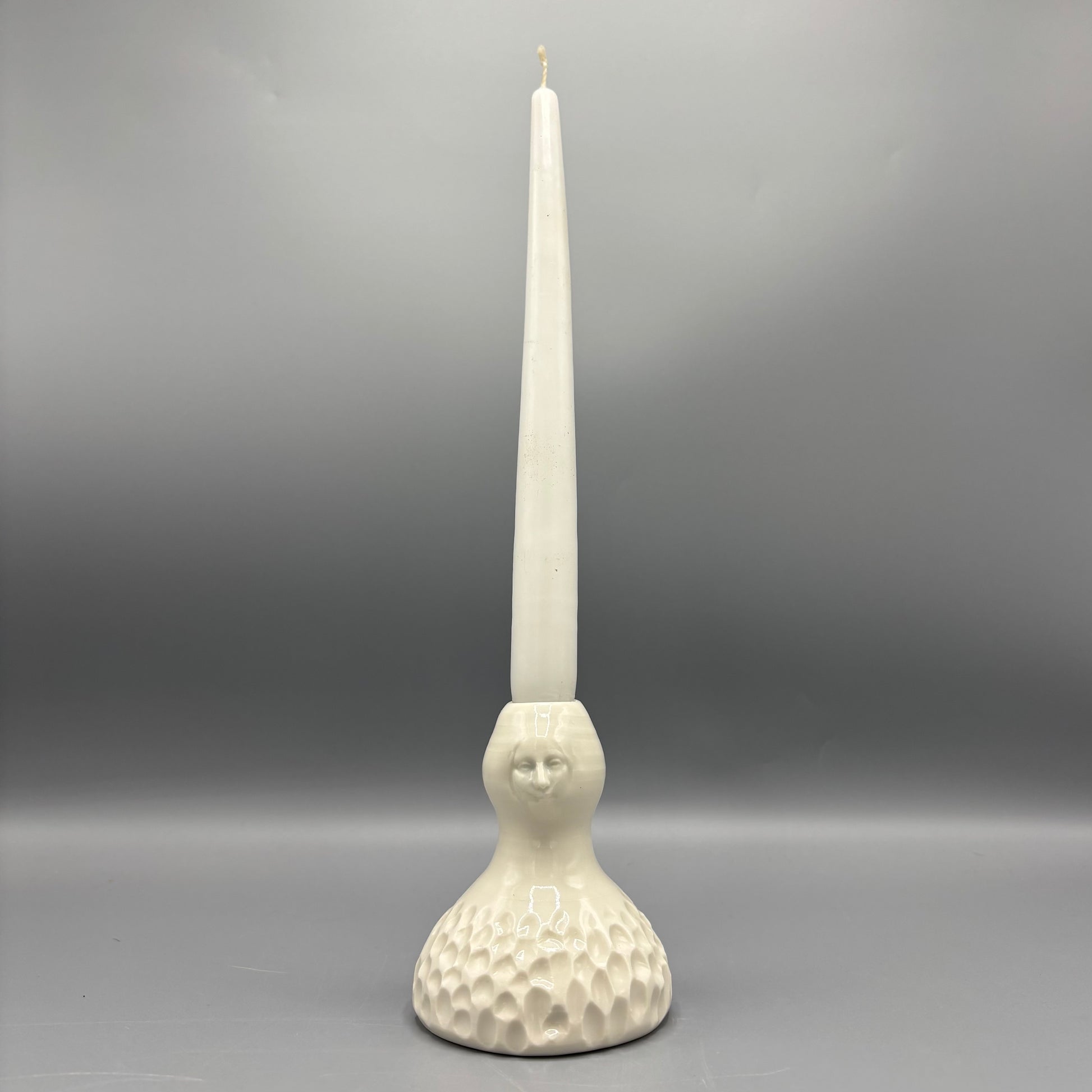 Hand-caved porcelain candle holder with impressed figurative detail by Anja Lubach.