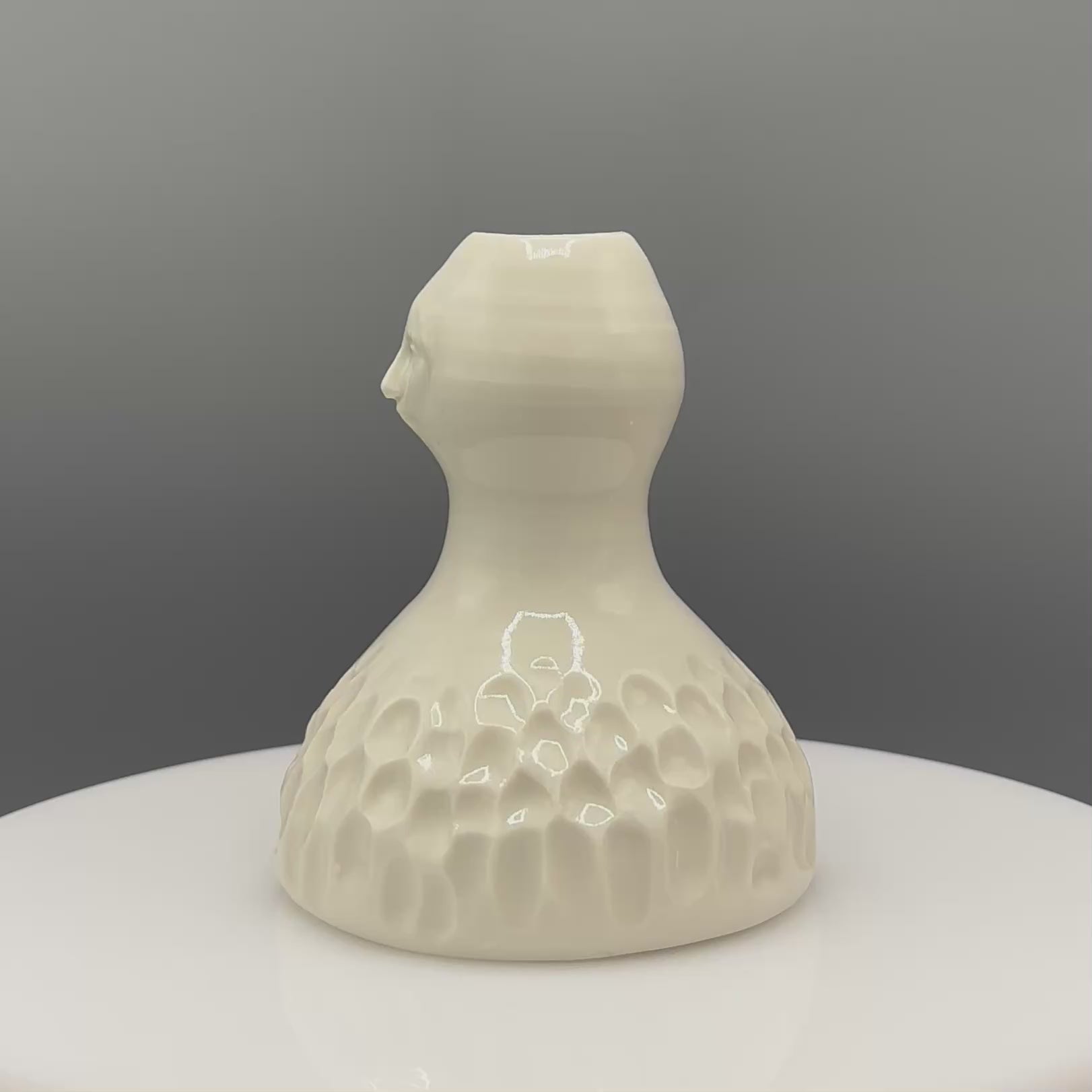 Figurative details are taken from religious figurines, the human body and ornamental surfaces. These are then transferred as delicate 3D relief back onto the wheel thrown vessel walls, appearing to push through the surface of the vessels with a sense of animation and metamorphosis.