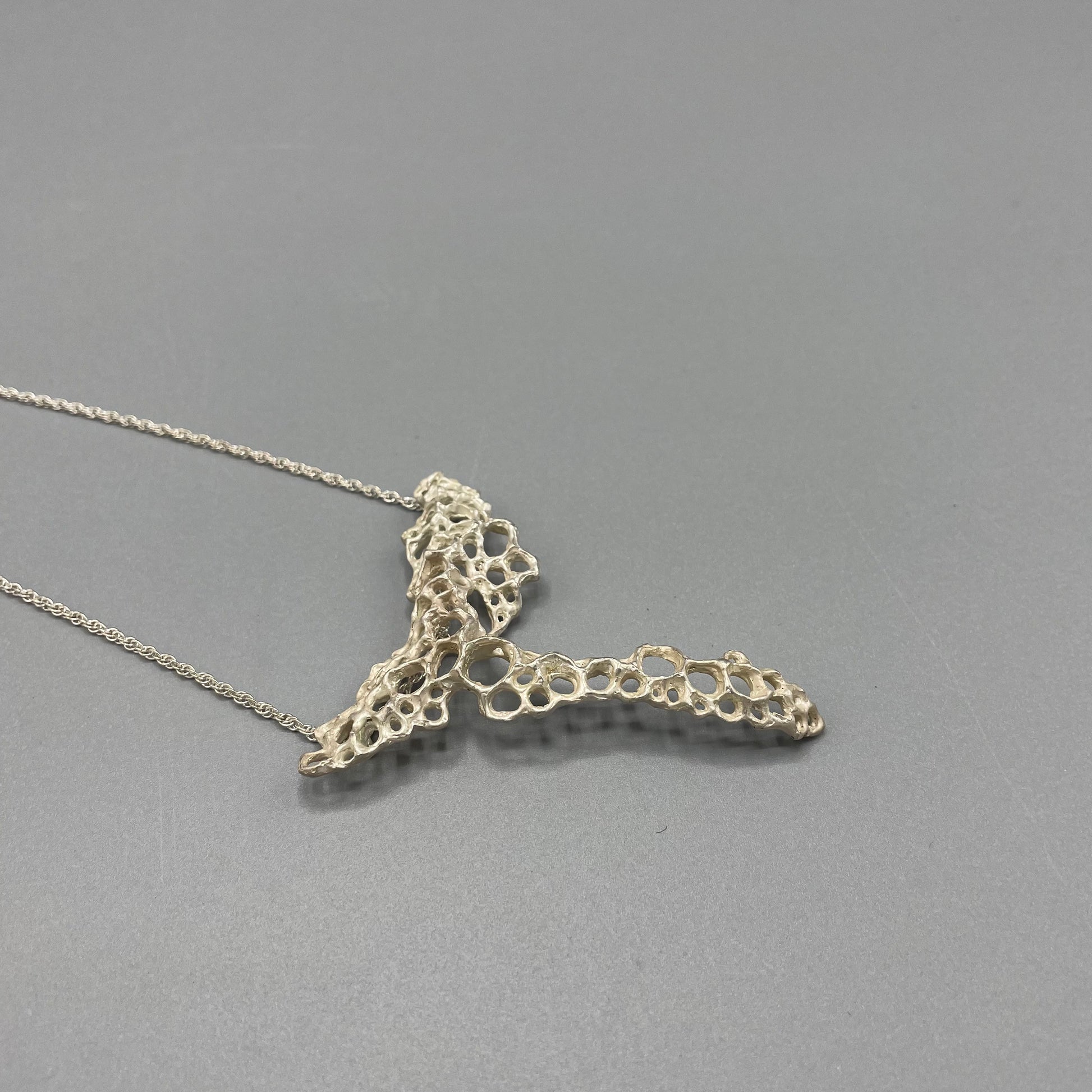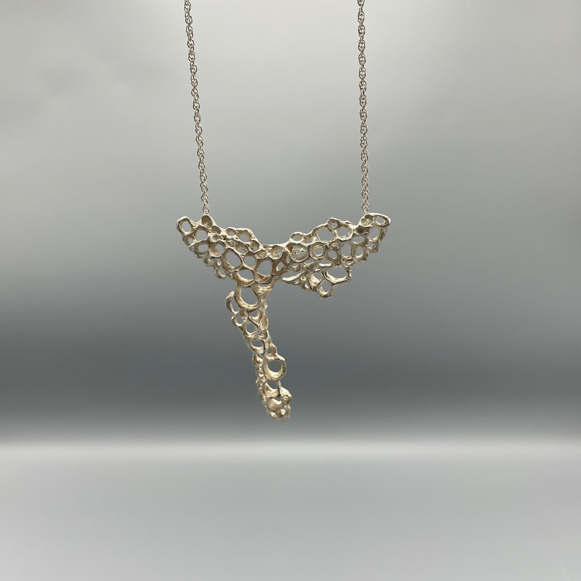Handmade silver necklace by Beca Beeby. Cast in silver from wax, Beca takes her inspiration from natural honeycomb.