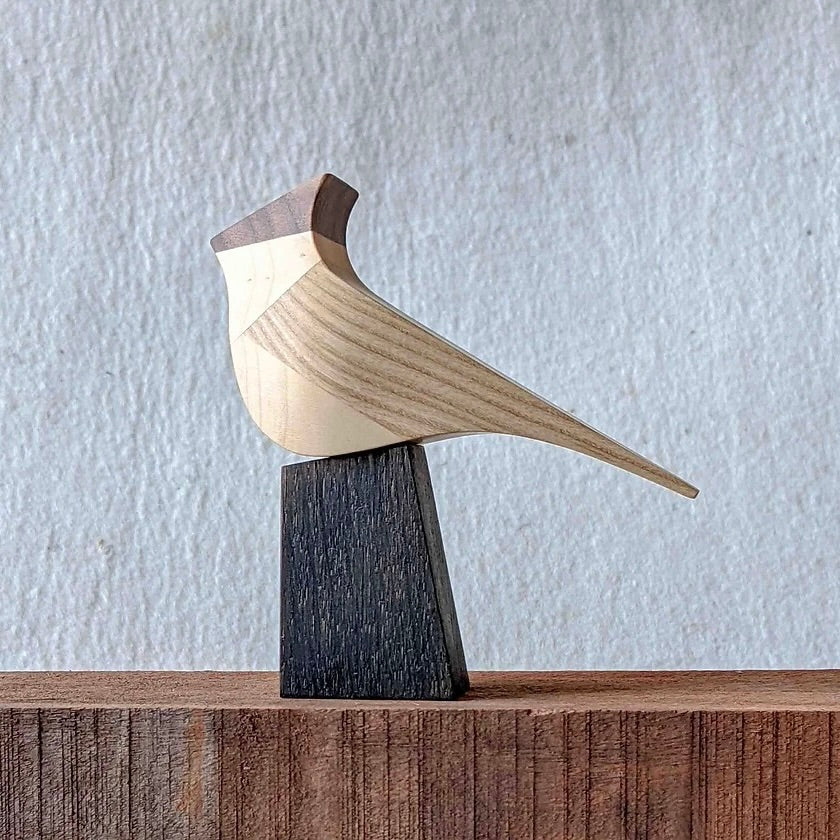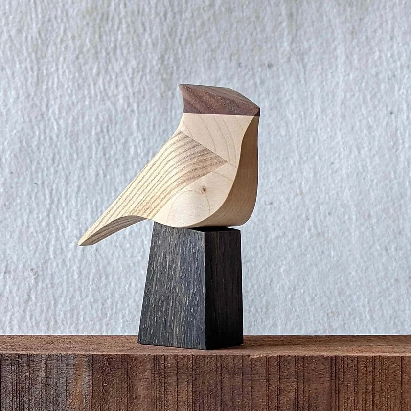 This Crested Tit is one of an ongoing series of birds made from contrasting hardwoods. comprises of sycamore, ash and black walnut. Perch in stained ash which allows the Tit to sit in a variety of poses.