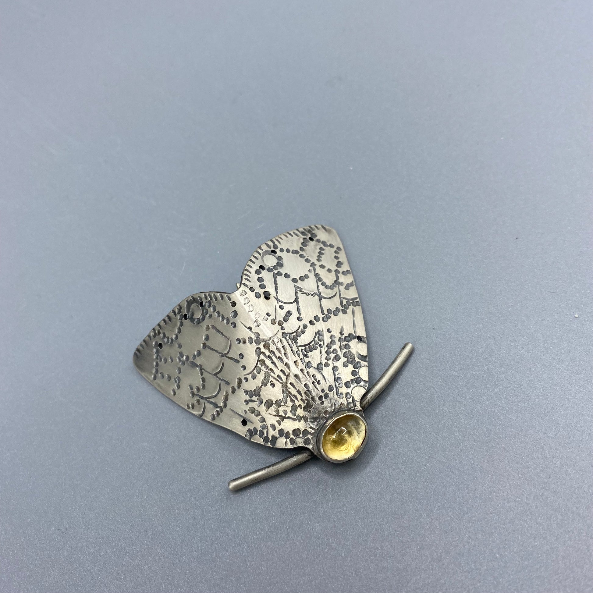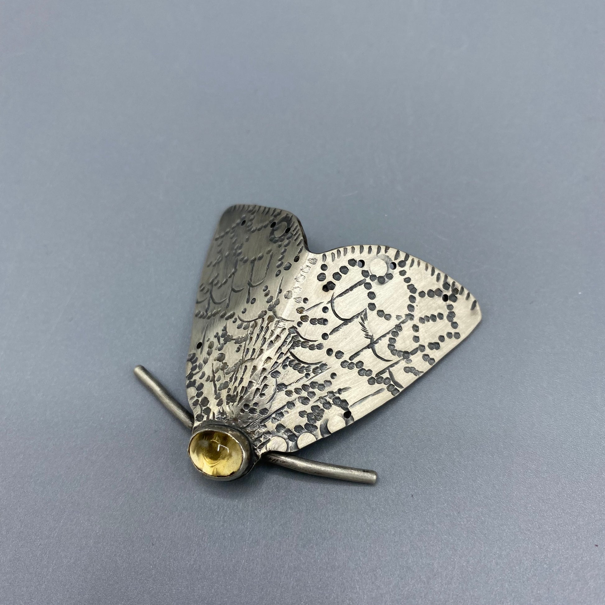 Stunning lace moth brooch by Emma McGilchrist with sterling silver, citrine cabochon and a silver nickel pin. This wonderful brooch would make the perfect gift.