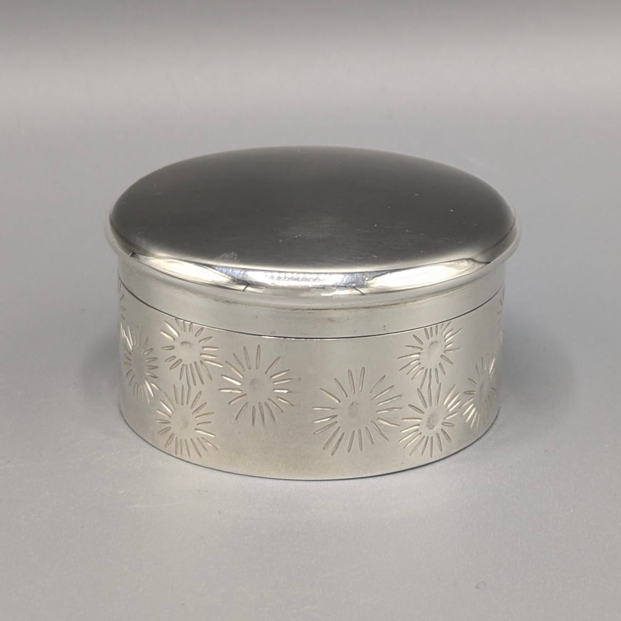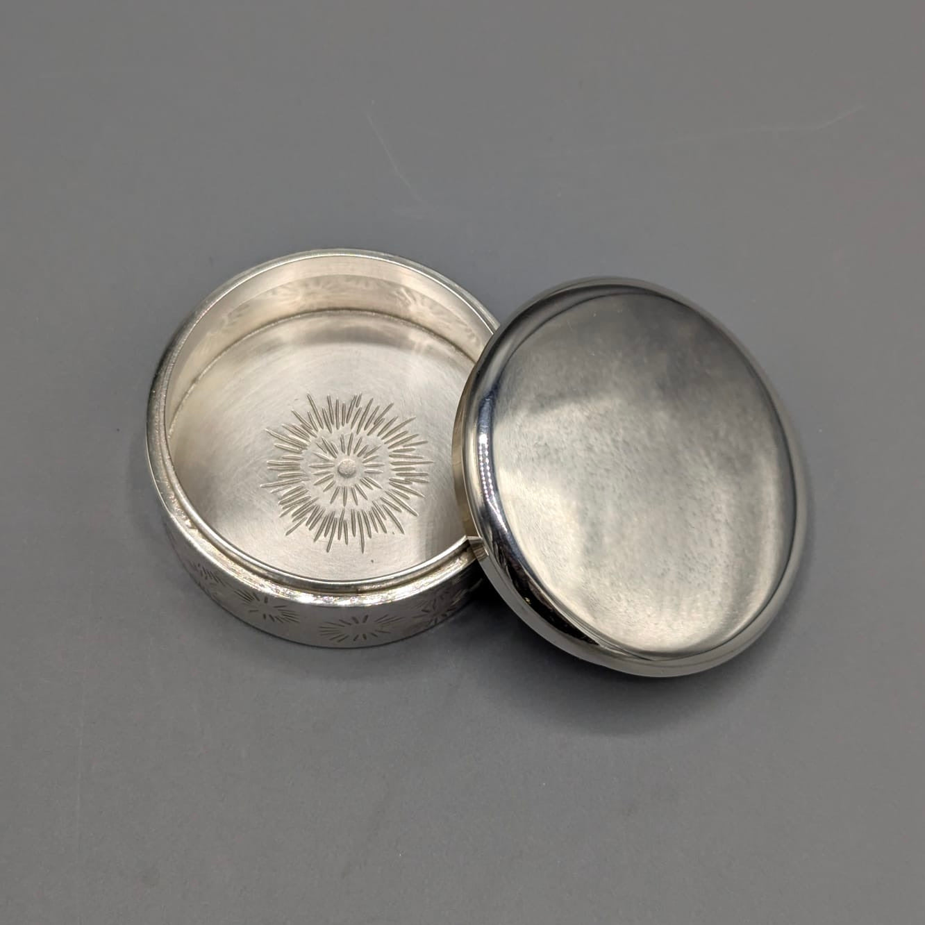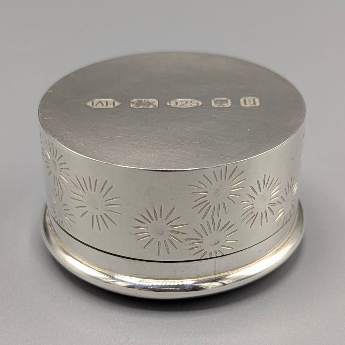 Handmade Silver Sunburst Box by Iona Hall with sun etchings round the outside.