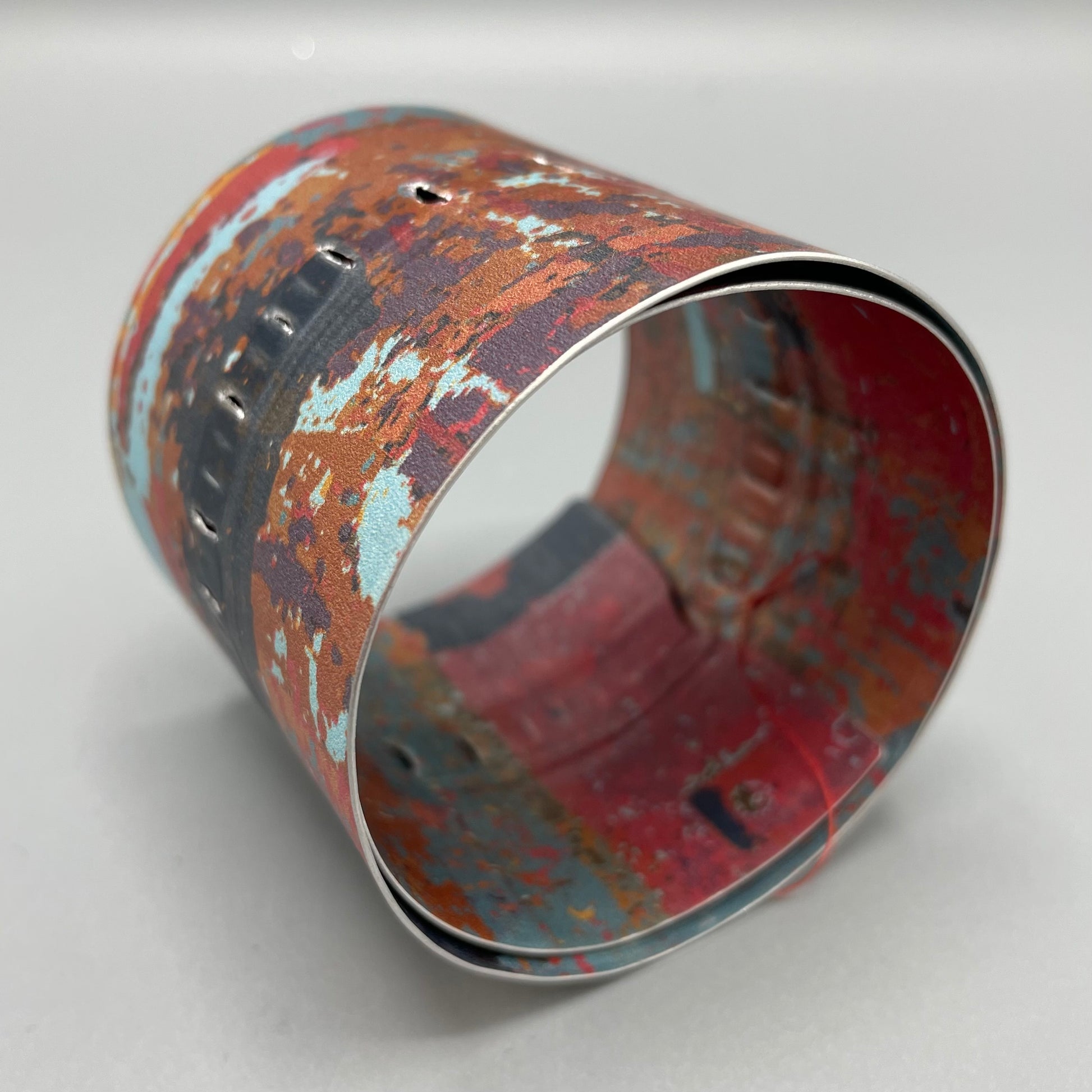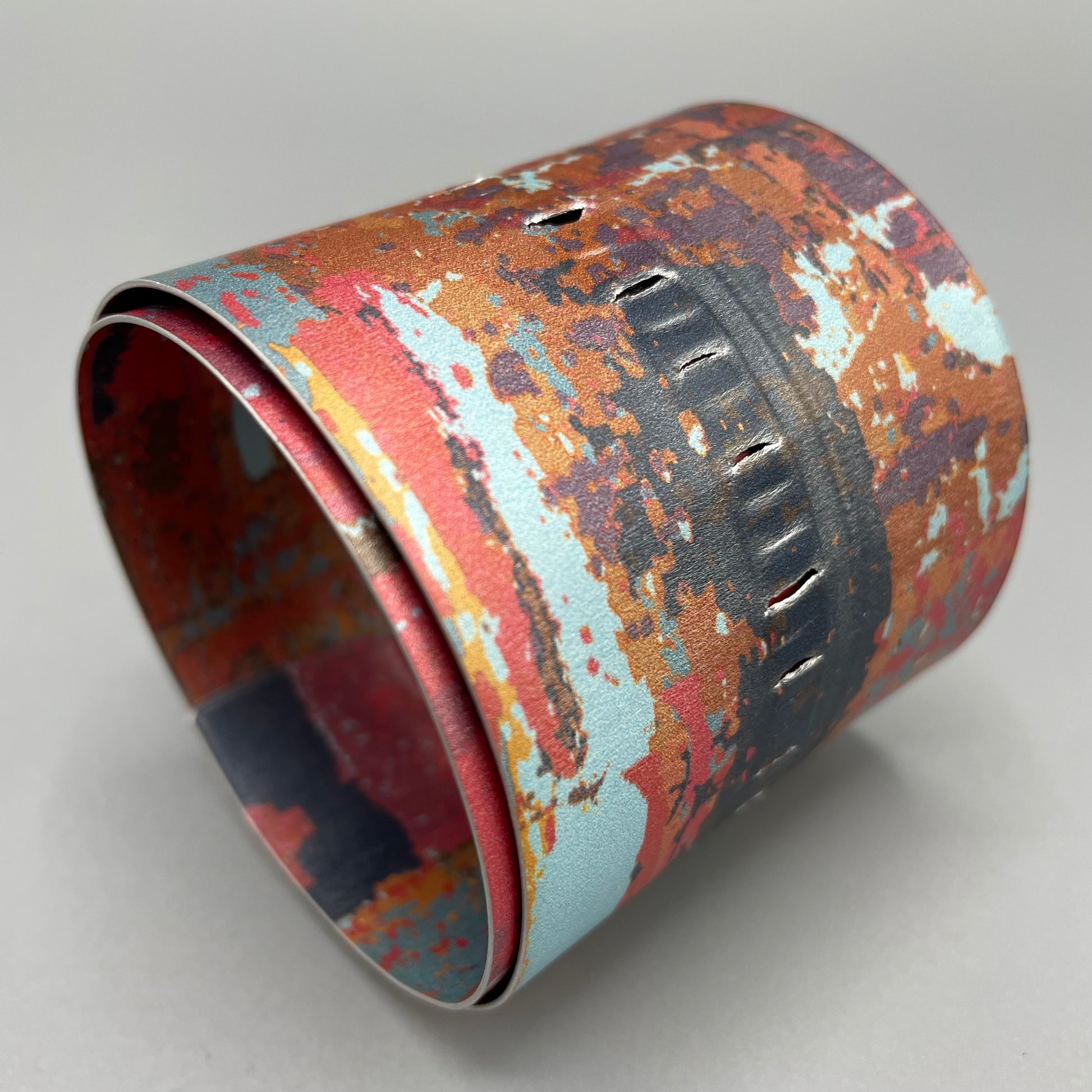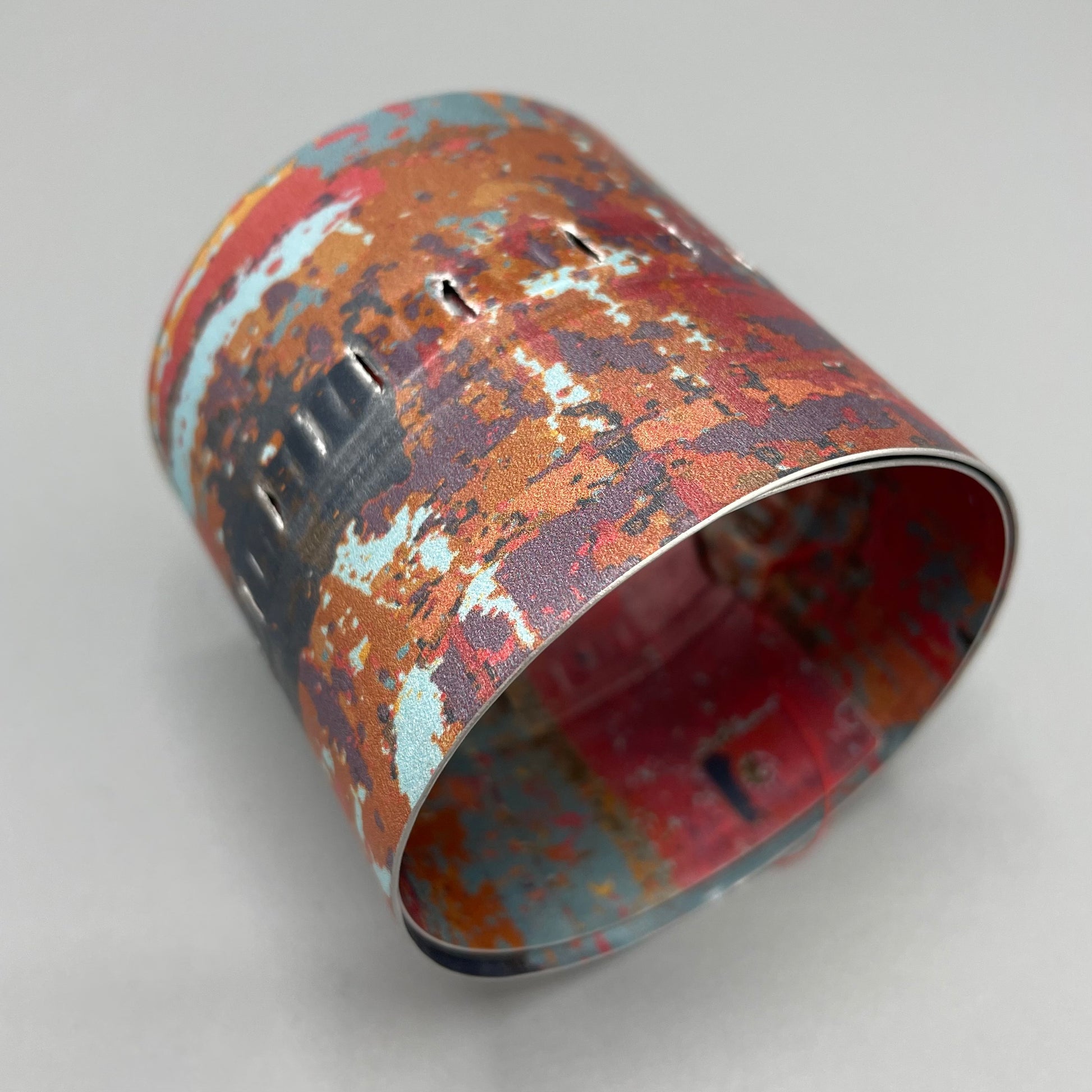 Anodised aluminium statement cuff; red colour way, of textured & folded construction.
