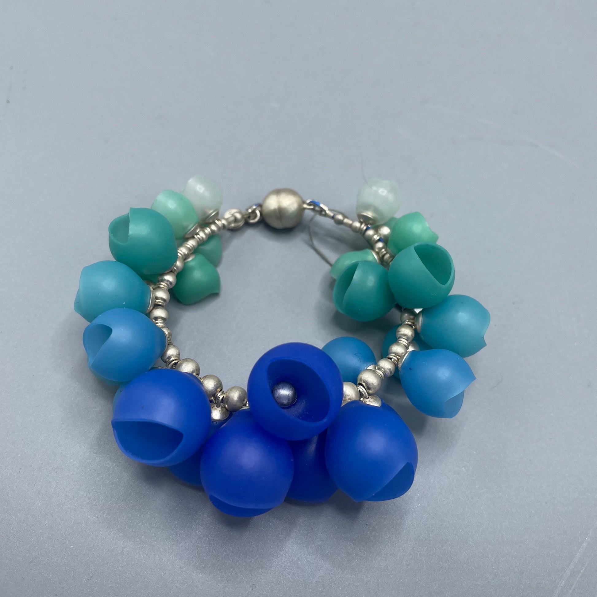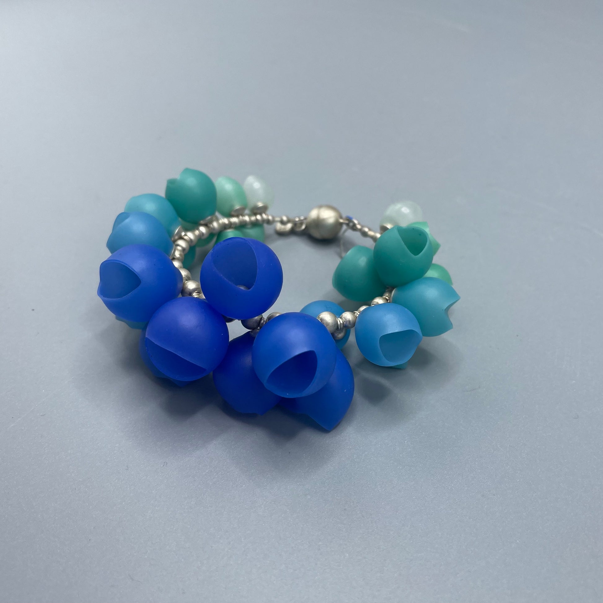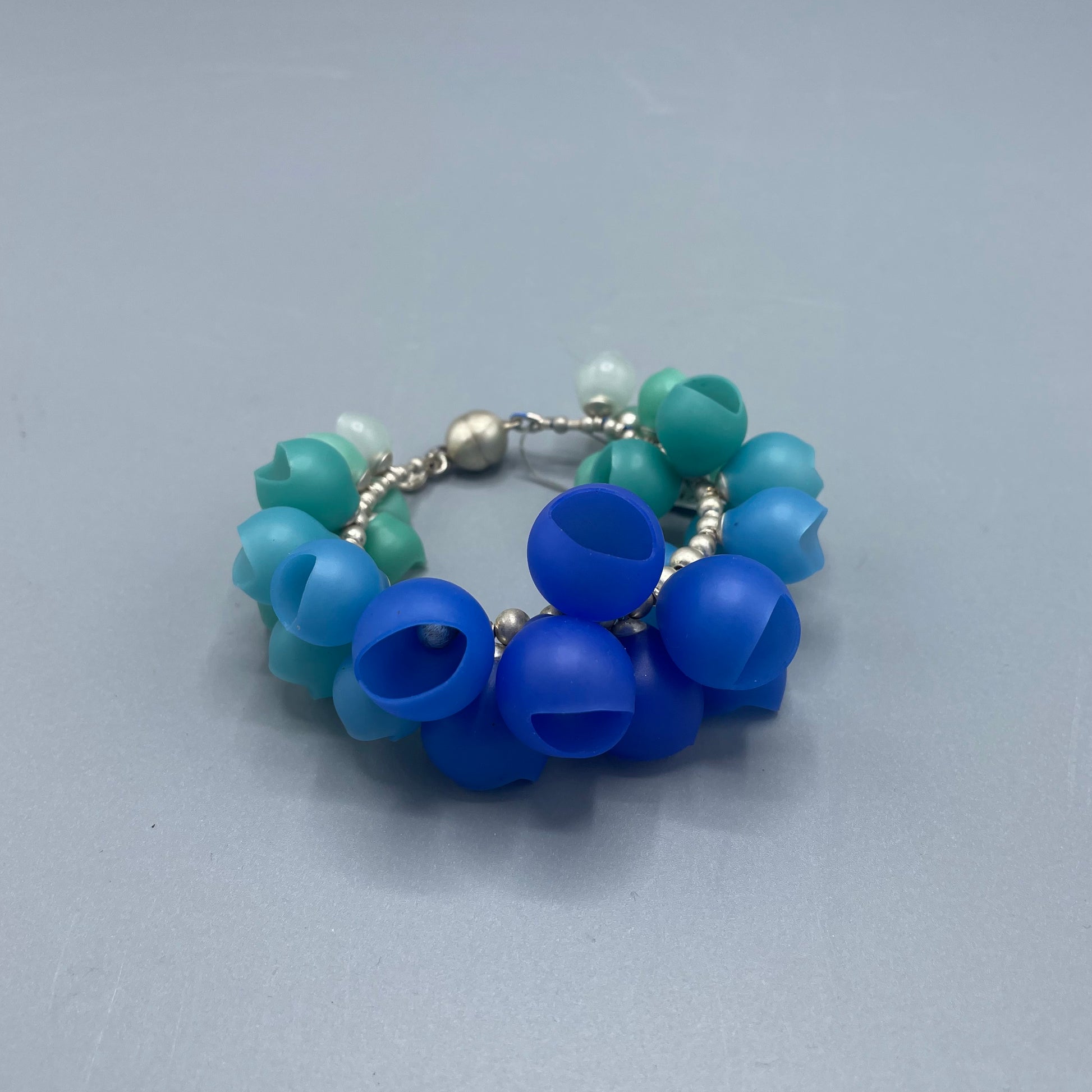 Sterling silver & silicone graduating cluster bangle, of blue & green silicone components, mounted on silver with silver spacers, on nylon cord with a magnetic ball clasp.