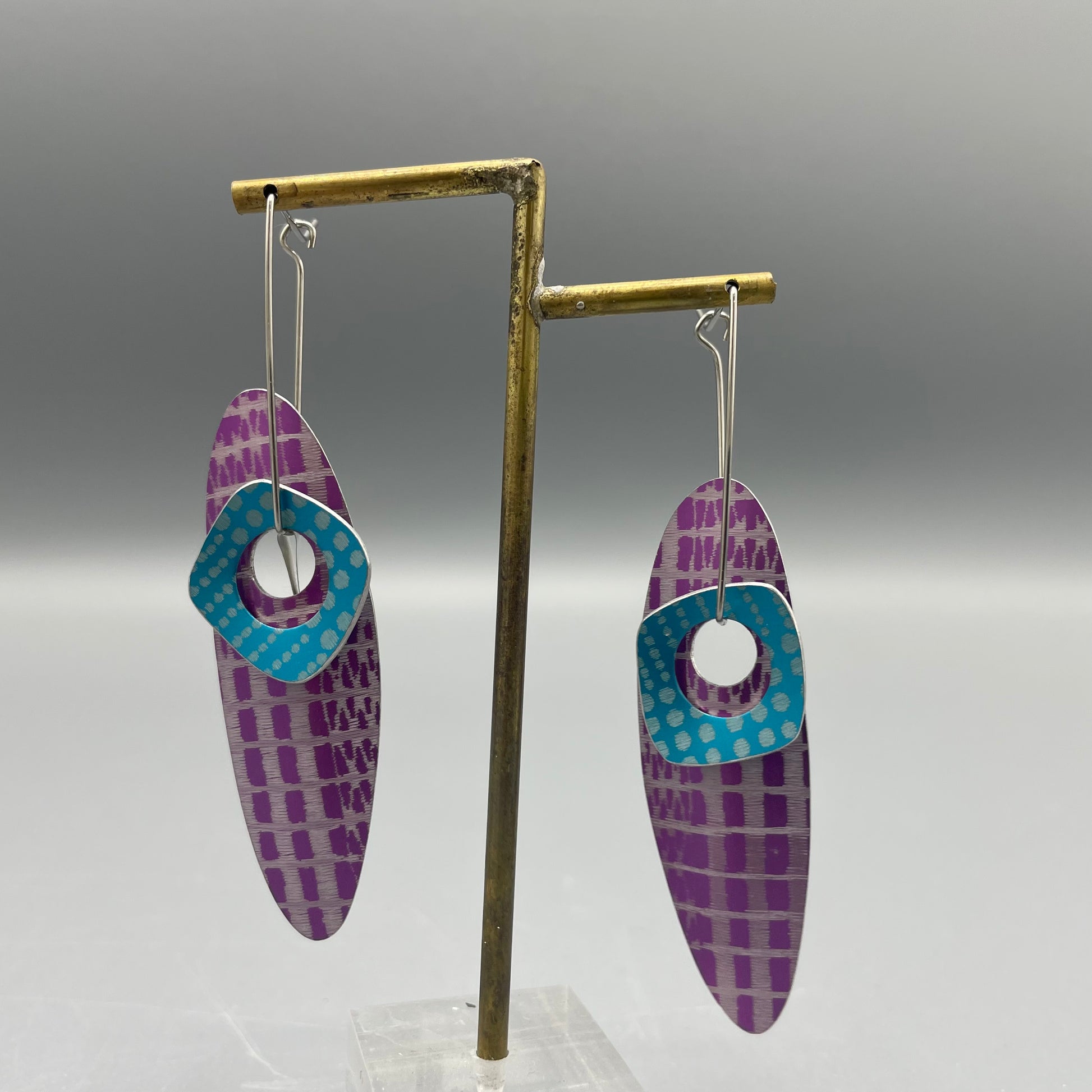 Handmade anodised aluminium drop earrings by Mandy Nash with surgical steel posts.