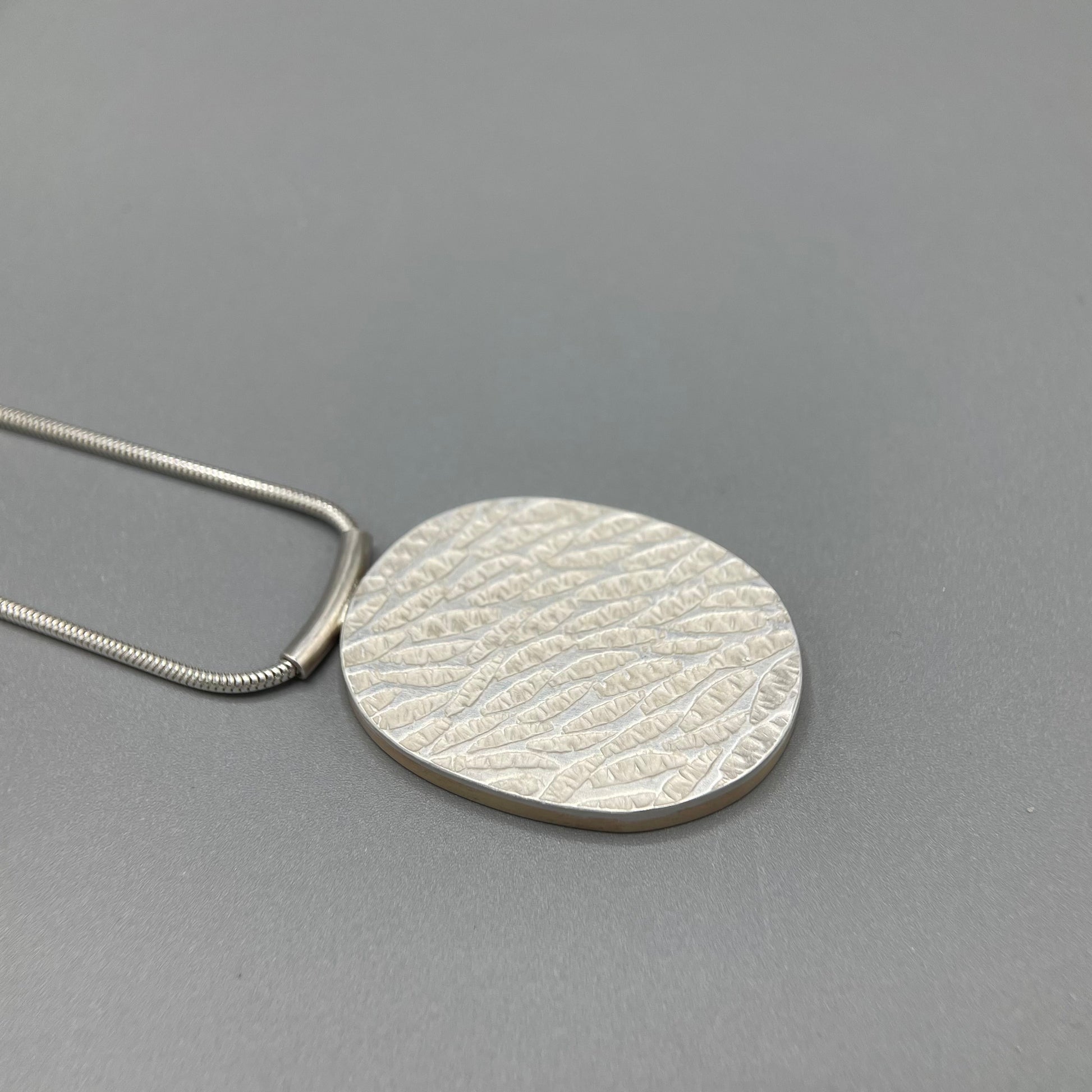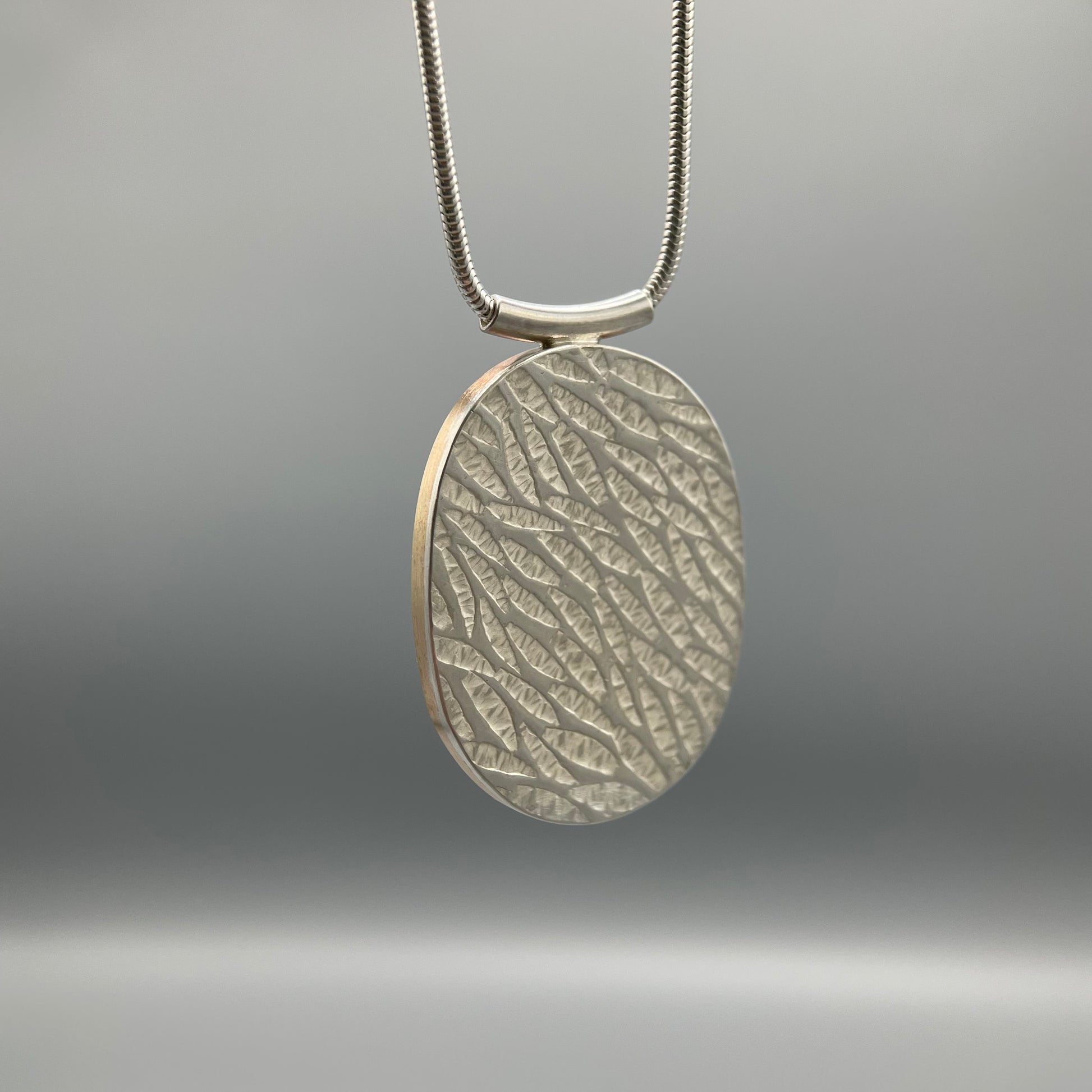 Embossed petals largest oval drop pendant necklace with petals embossed fine silver, red brass sides and back.