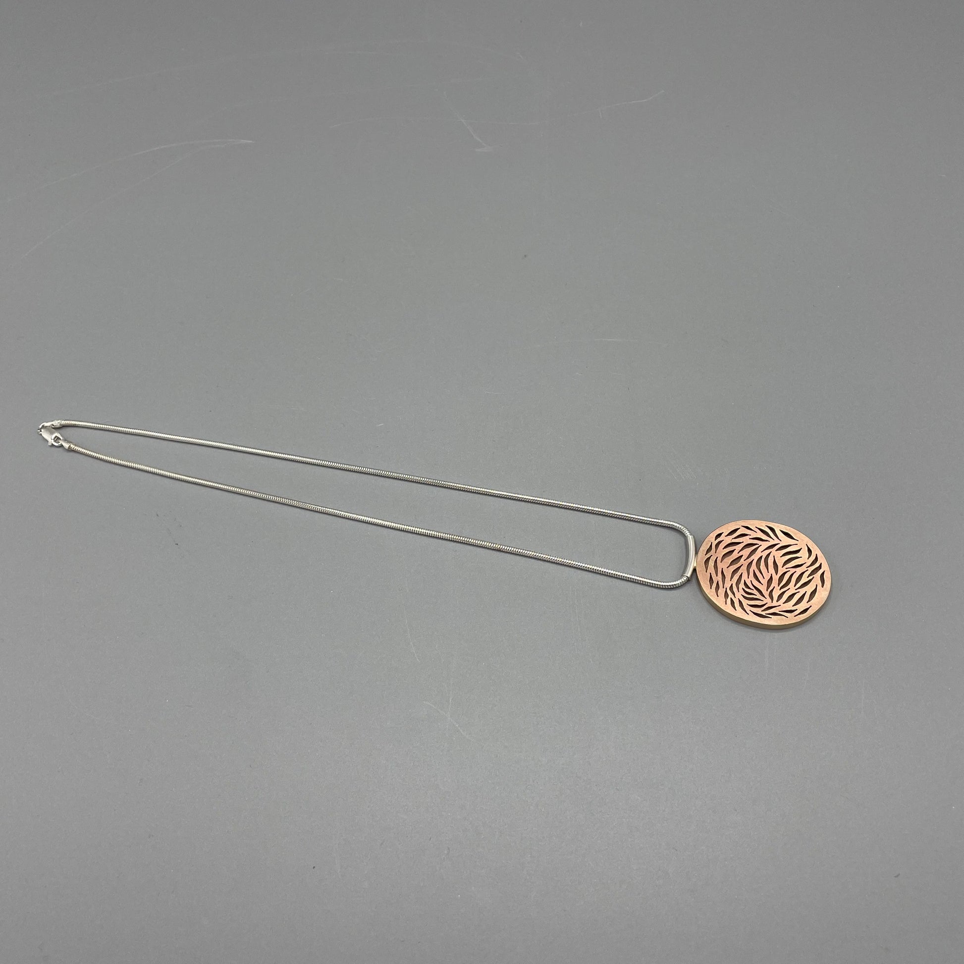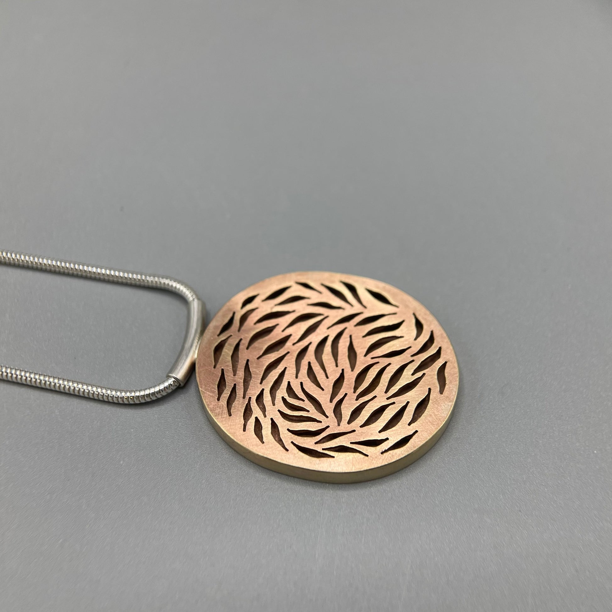 Pierced petals largest oval drop pendant necklace with pierced petals red brass front, sides and back.