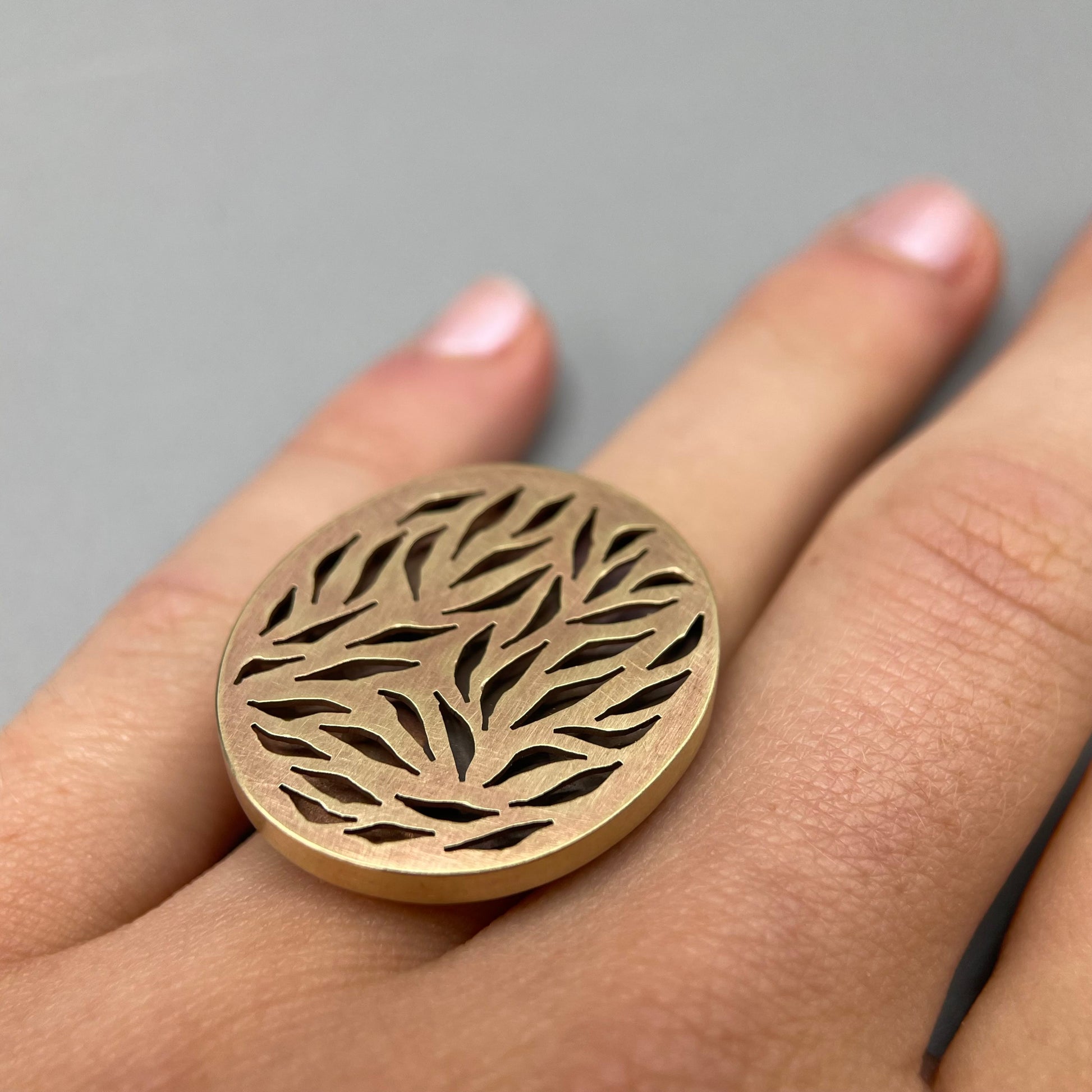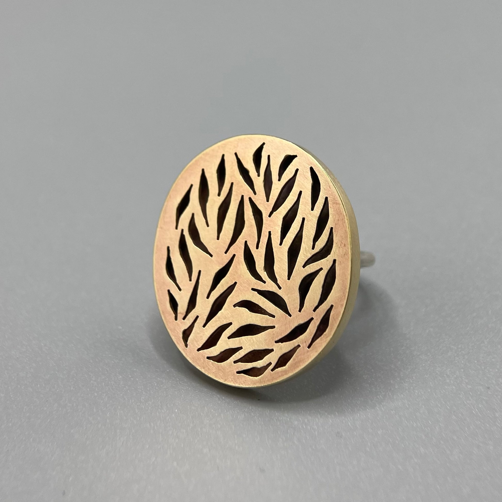 Pierced petals largest oval ring with pierced petals red brass front, sides and back.
