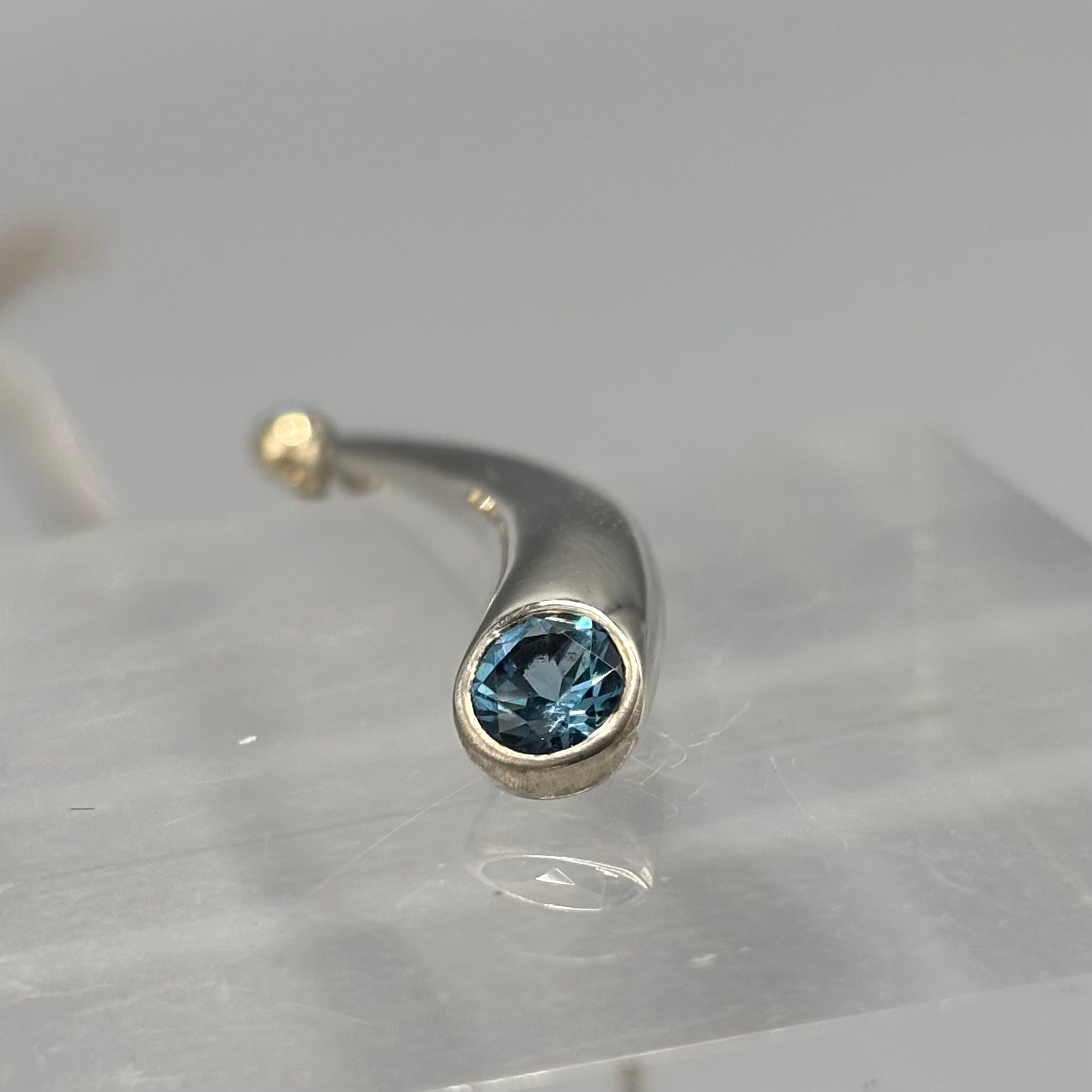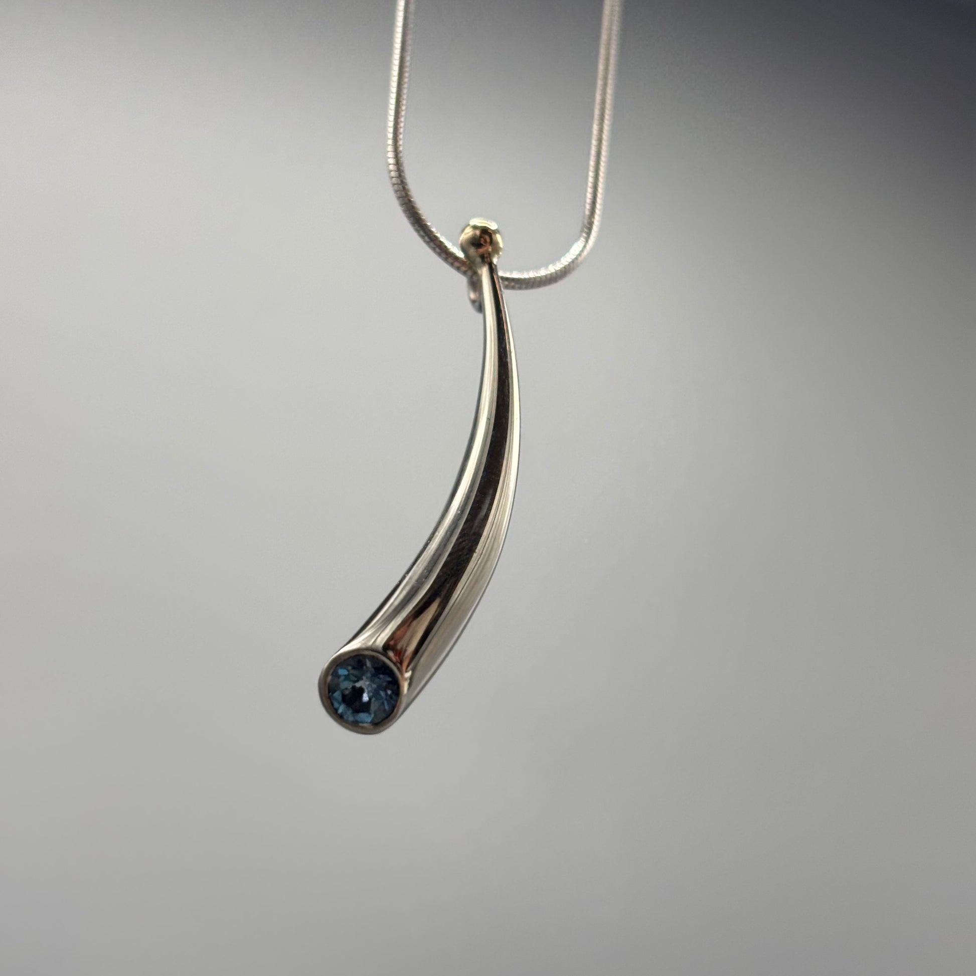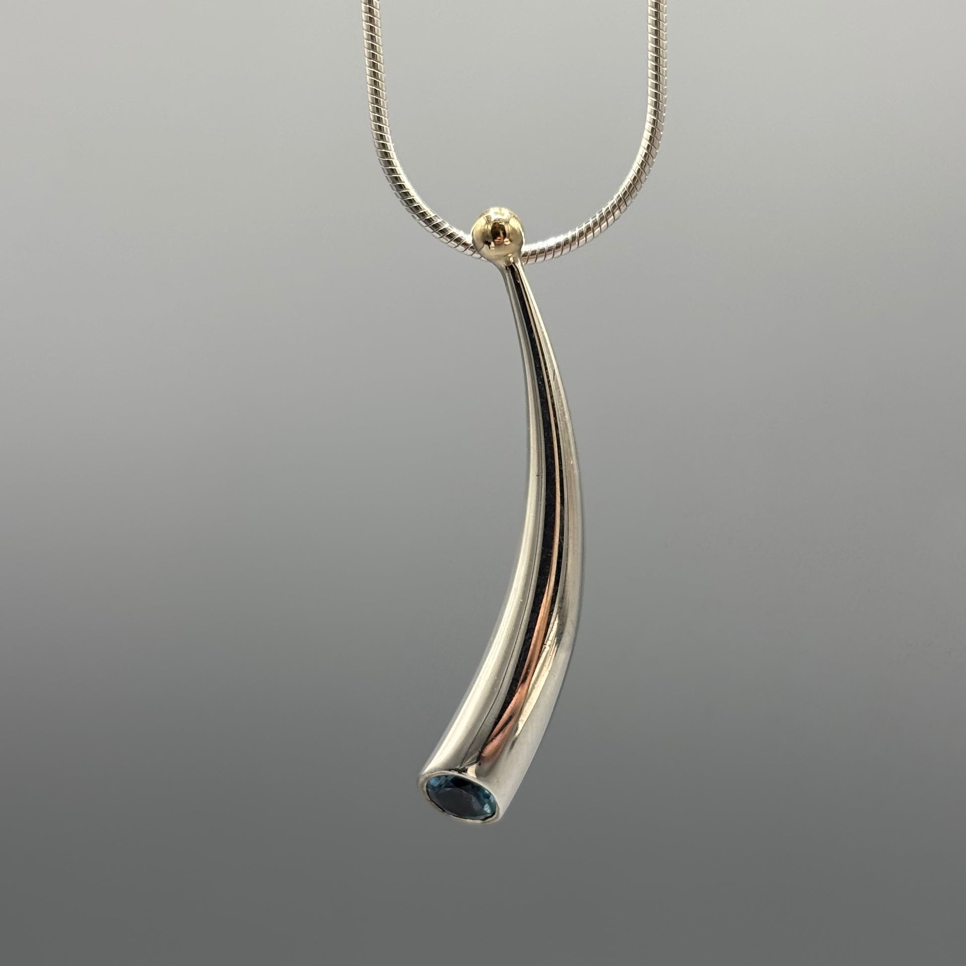 A stunning blue topaz gemstone is set in the elegant curved sterling silver pendant with chunky 18ct yellow gold bead. The sterling silver pendant tapers from 6mm and has a height of approx 38mm. A beautiful & pure design.