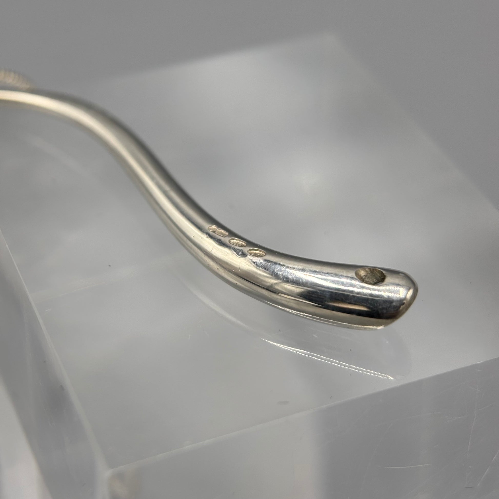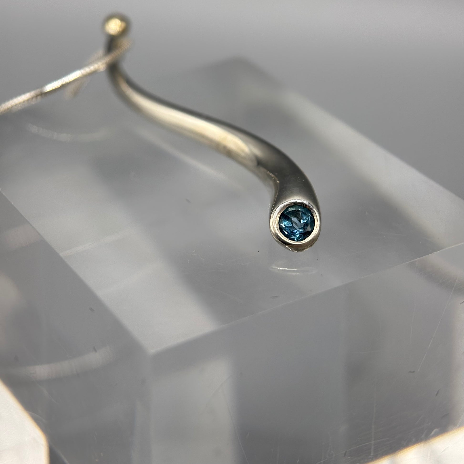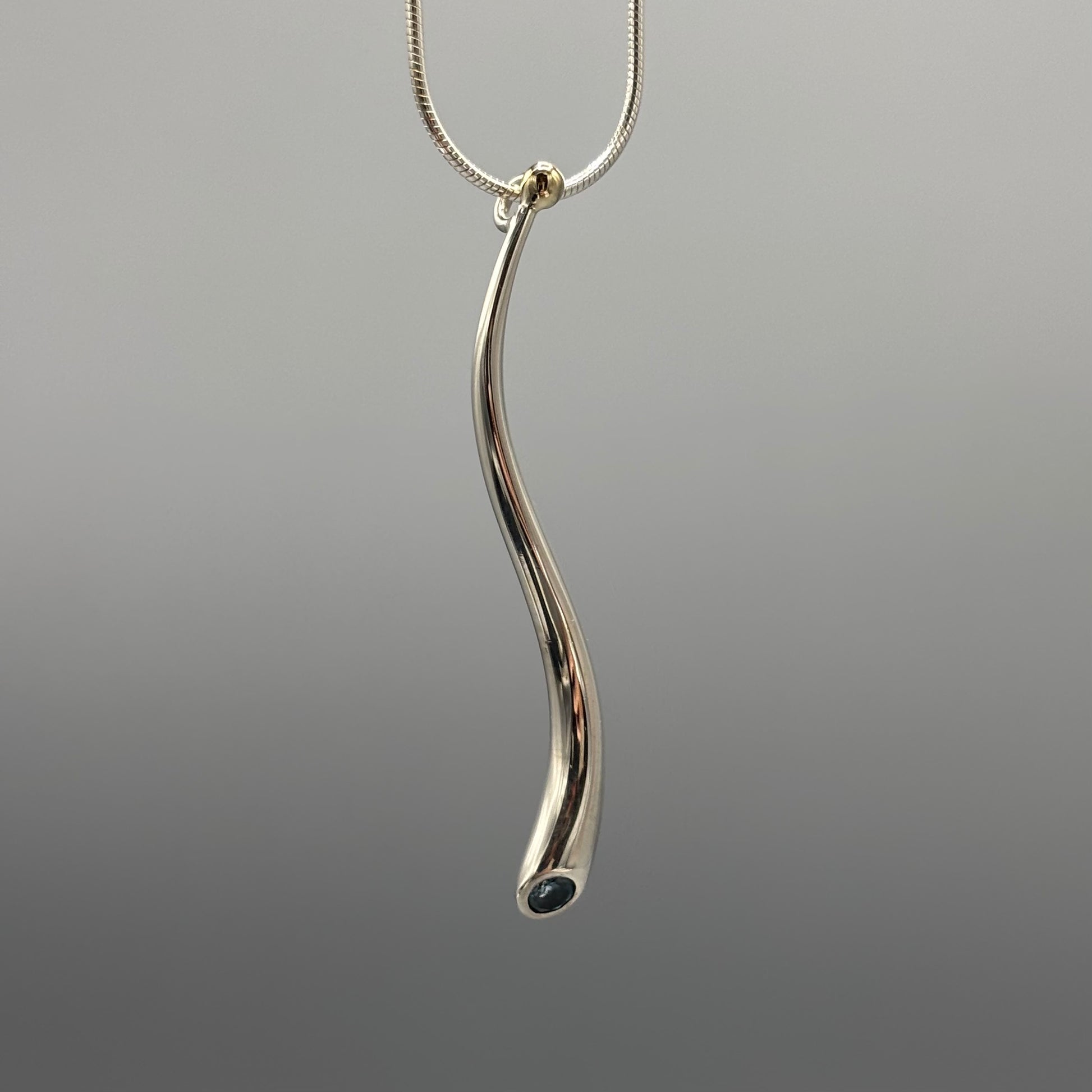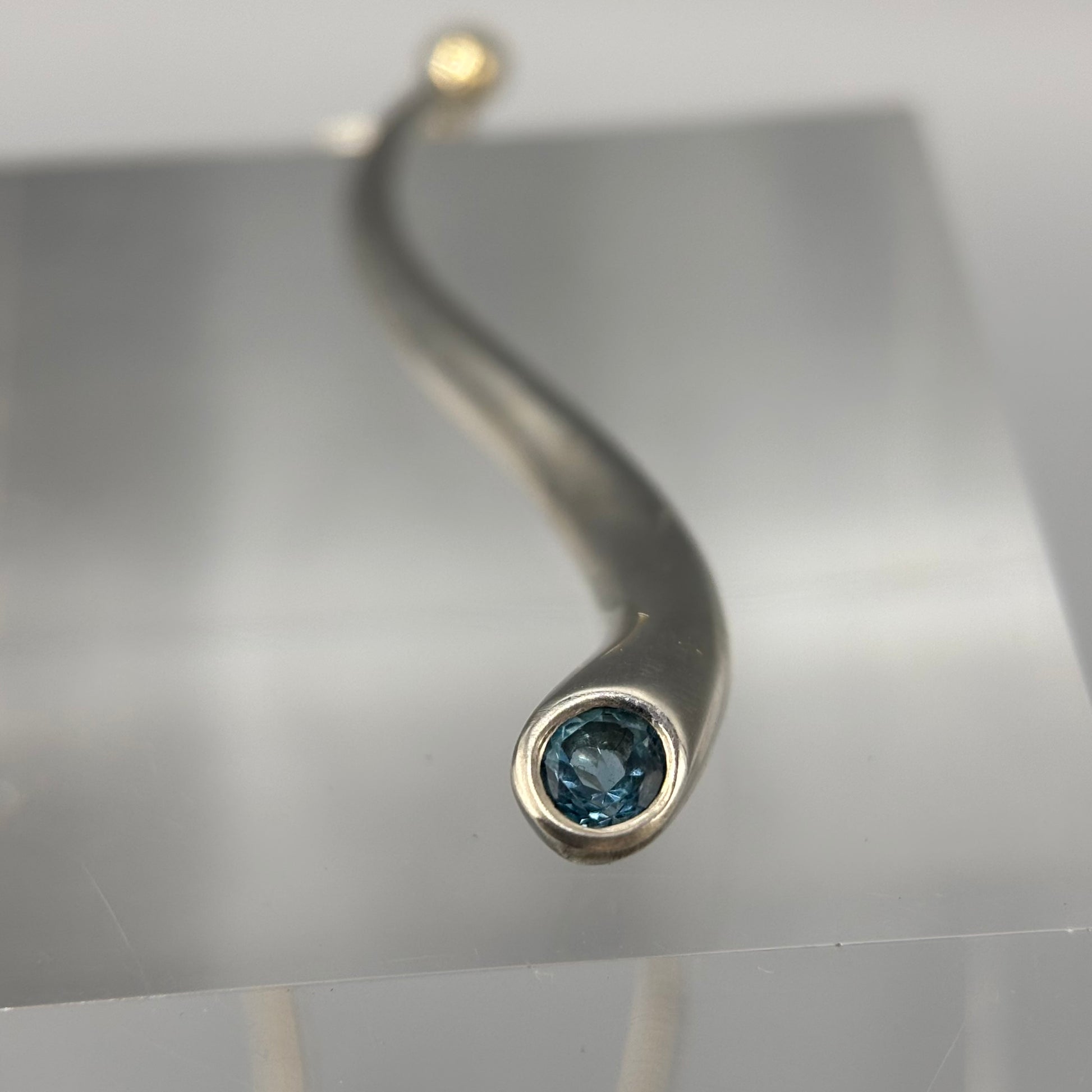 An elegant long curving wiggly pendant with 4mm faceted blue topaz and 18ct gold bead.The solid silver pendant tapers from 5mm and is approx 55mm long. The sweeping curves enhance the beautiful pure design.