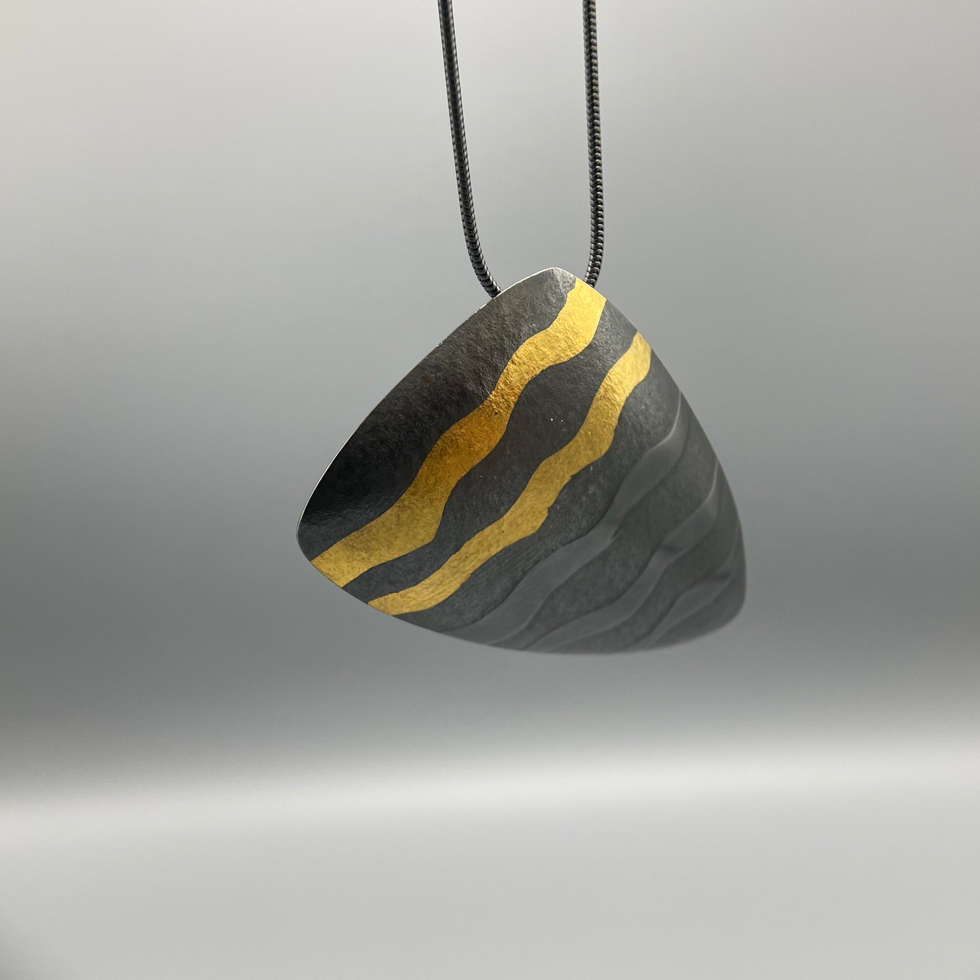 Oxidised shell form silver pendant with 24 carat gold waves and oxidised 18” silver snake chain.