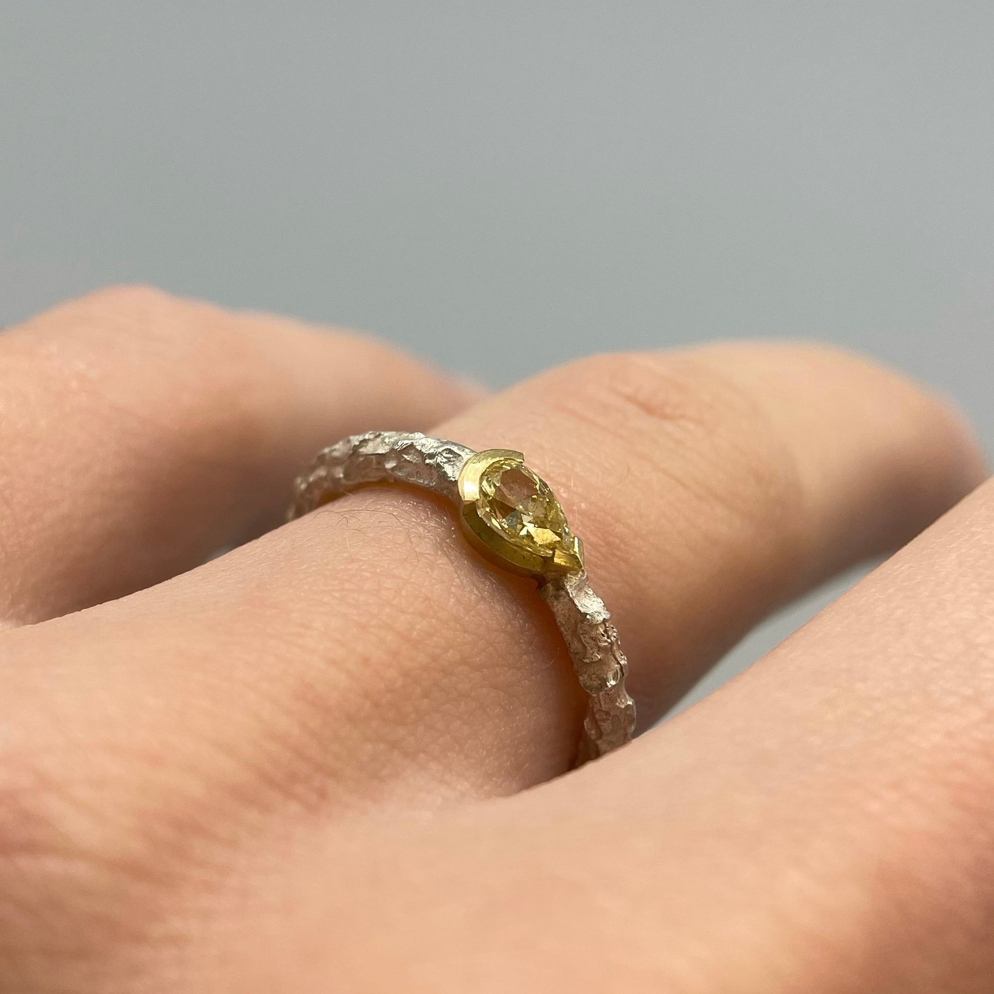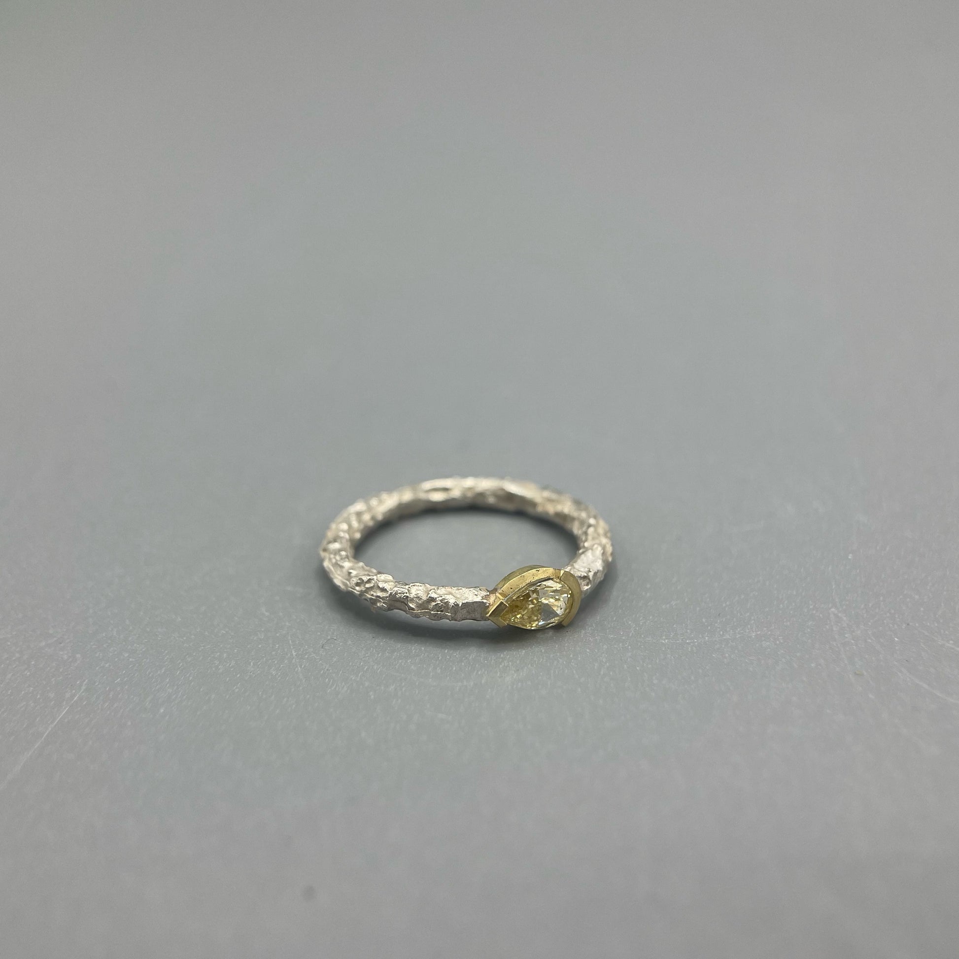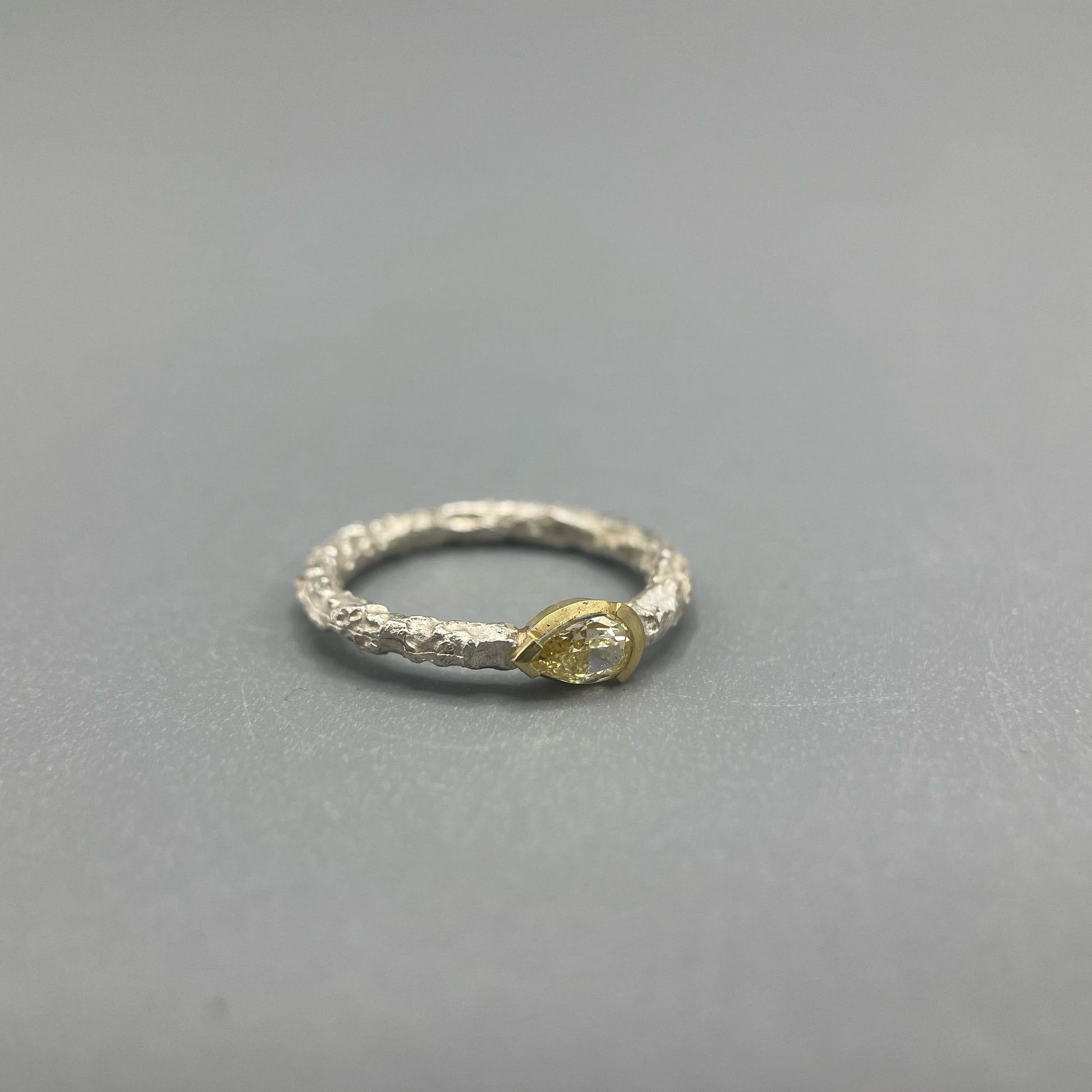 Narrow round etched silver ring with 18ct gold setting and champagne pear diamond
