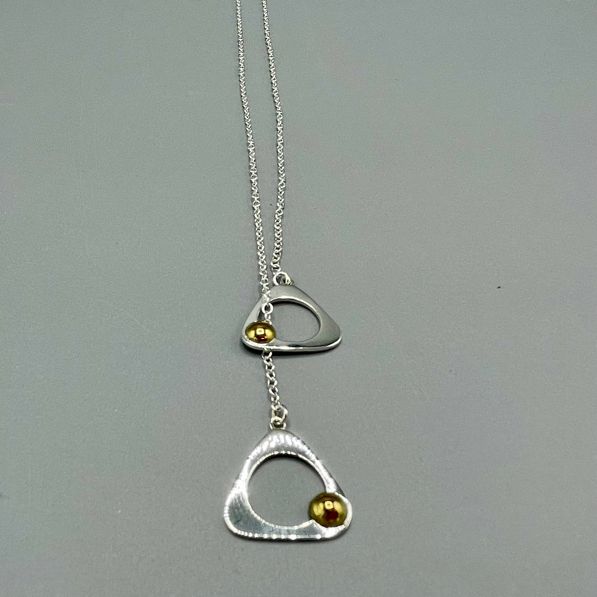 Silver handmade pendants with brass additional detail on a 25" silver belcher chain. Chain and pendants can be adjusted to hang at different heights.