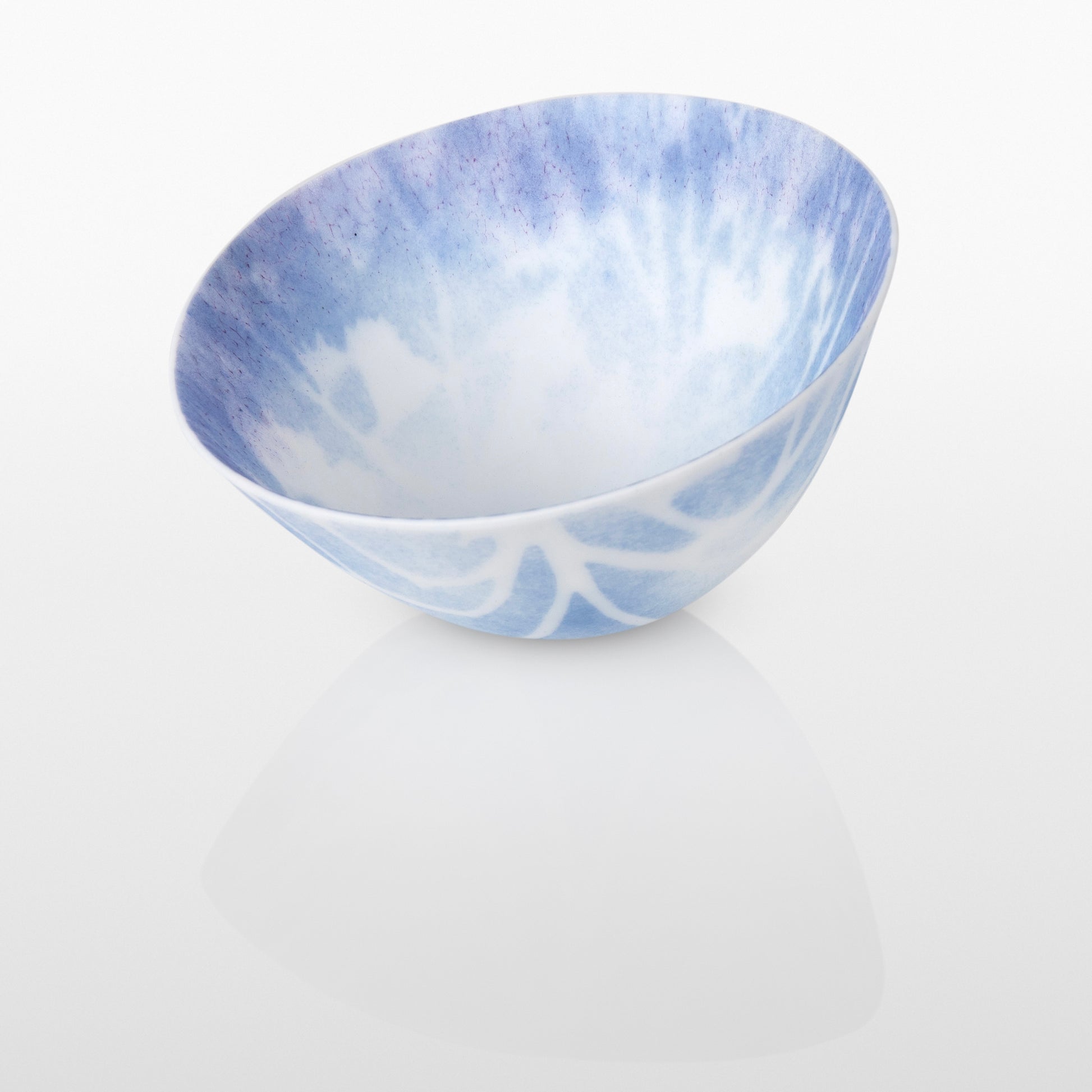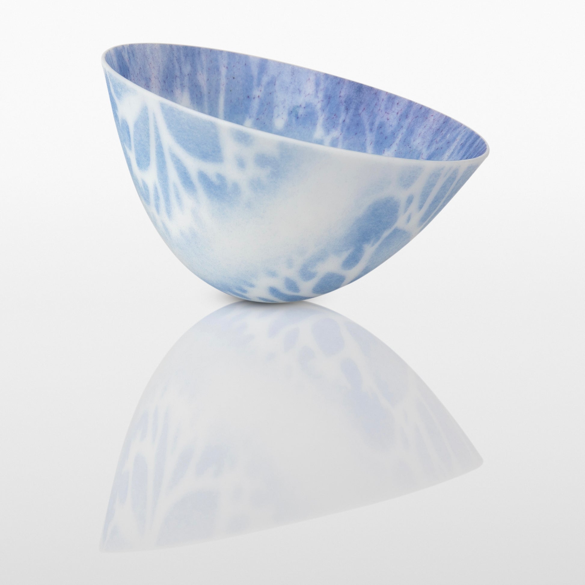 Handmade gravity-formed glass bowl by Verity Pulford in blue, purple and white glass.