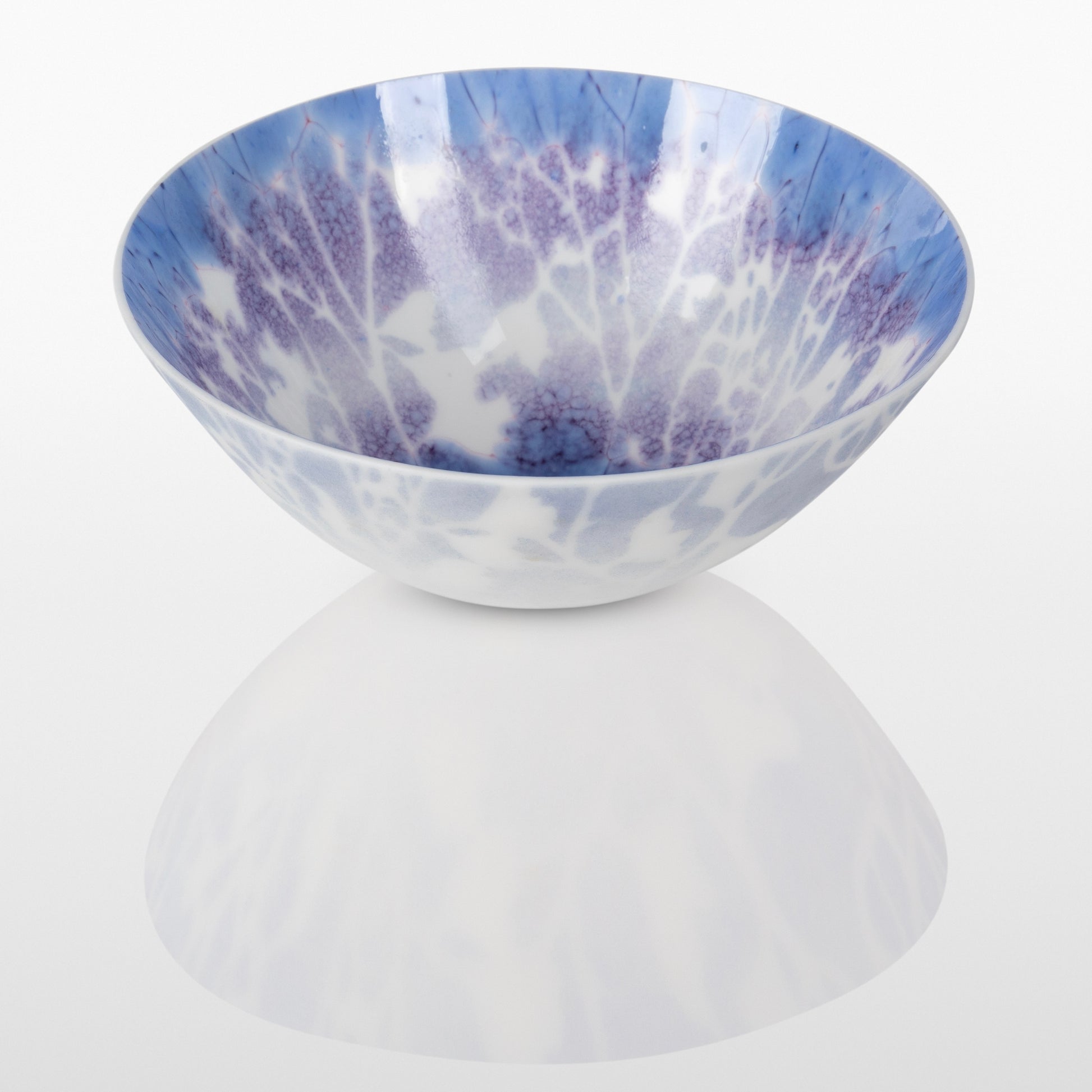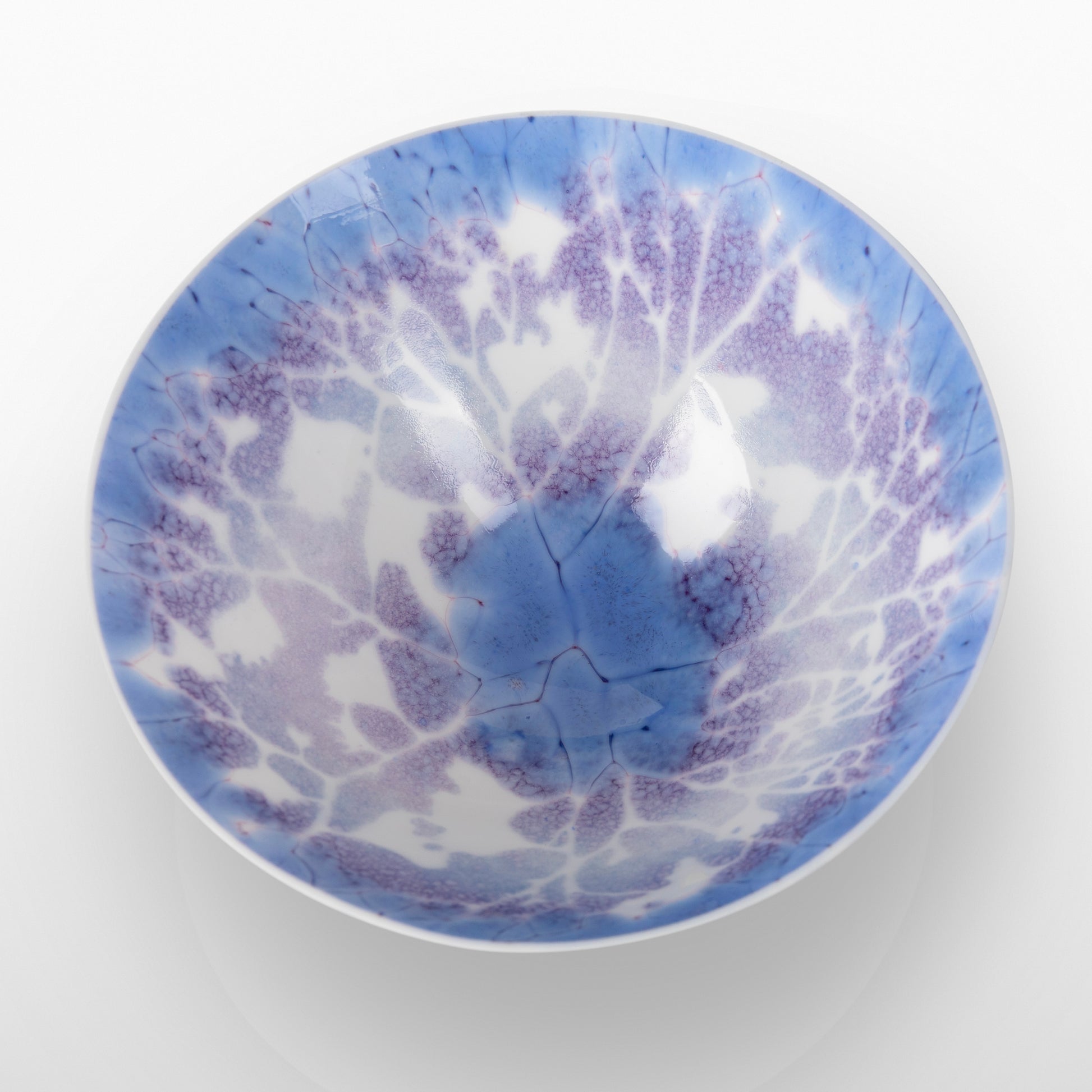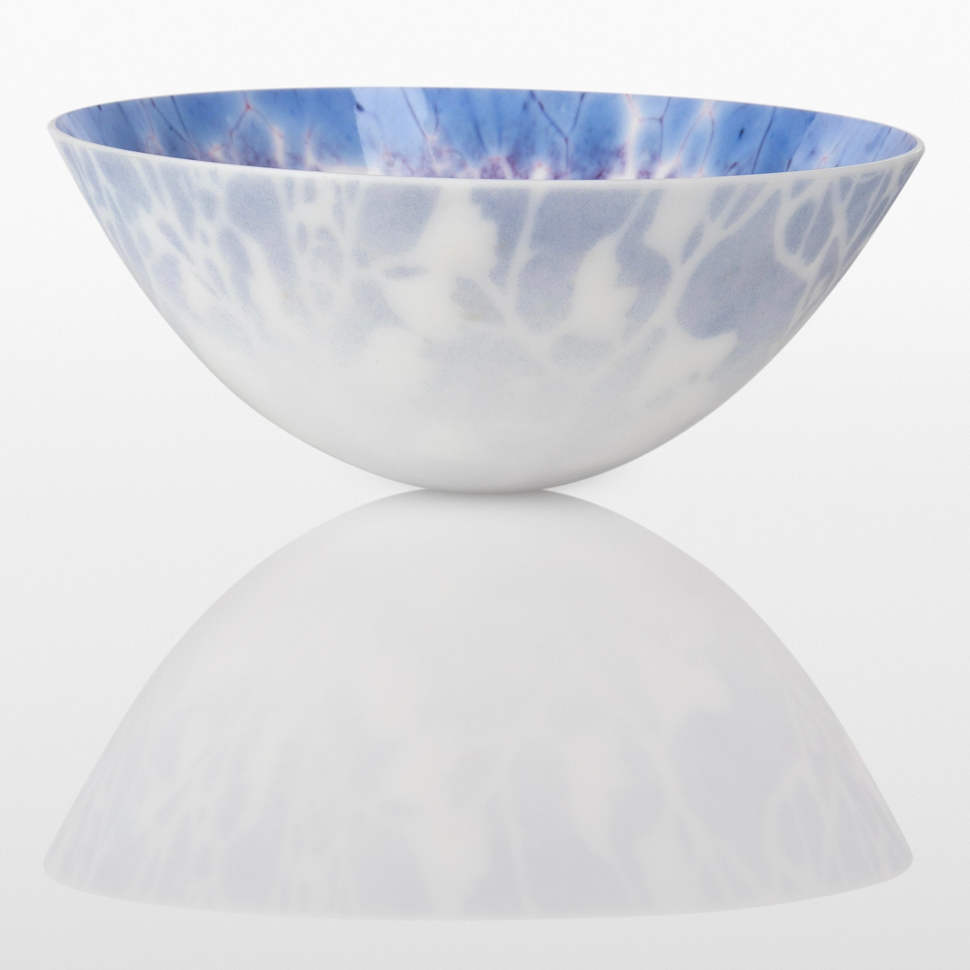 Handmade glass, large gravity-formed bowl in blue, purple and white glass by Verity Pulford.