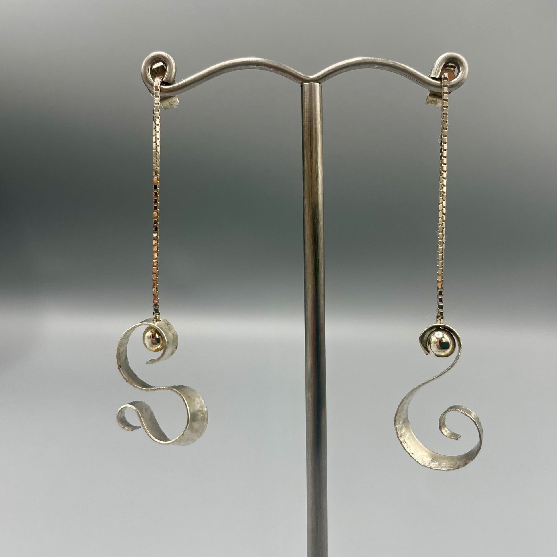 Handmade silver swirl long drop earrings by Victoria Sackwild.